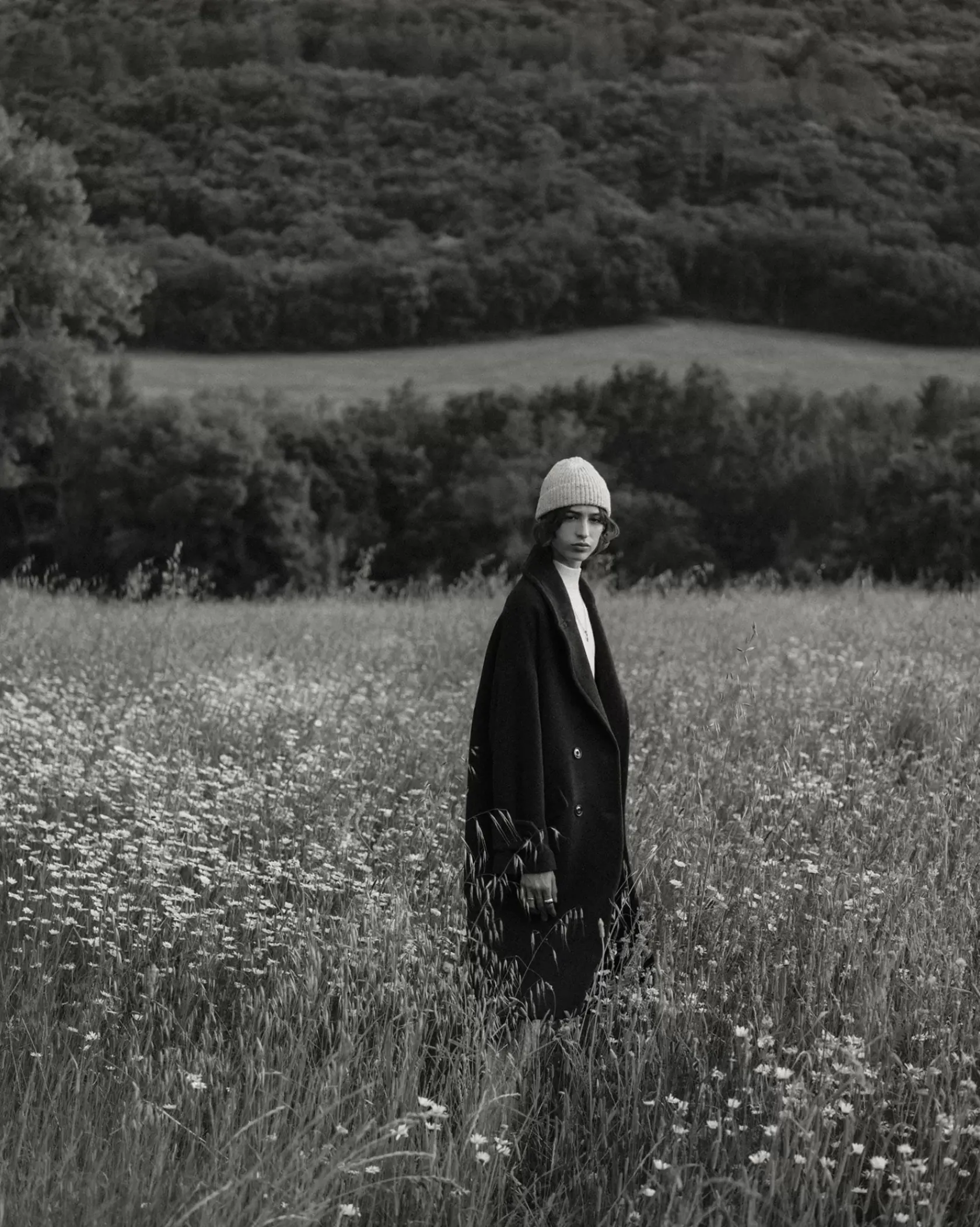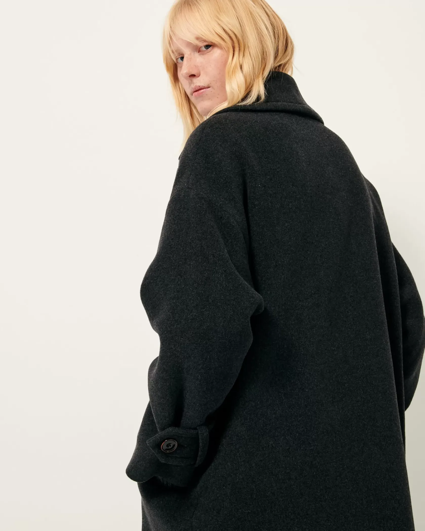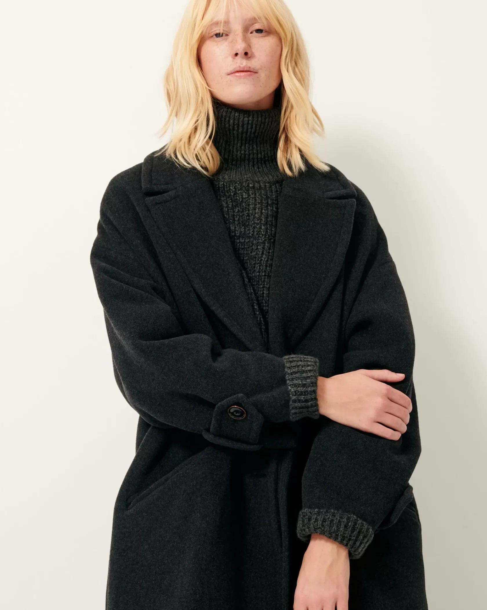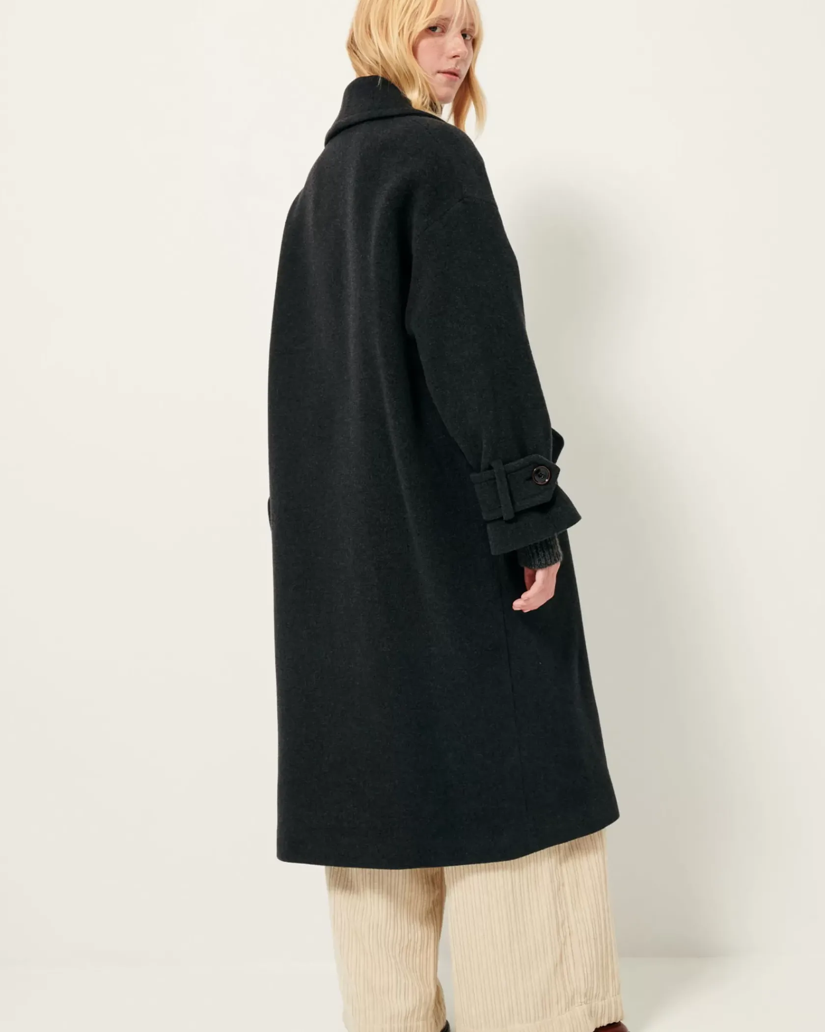 Manteau long à double boutonnage en double tissage melton finition velvet tissé en Italie.