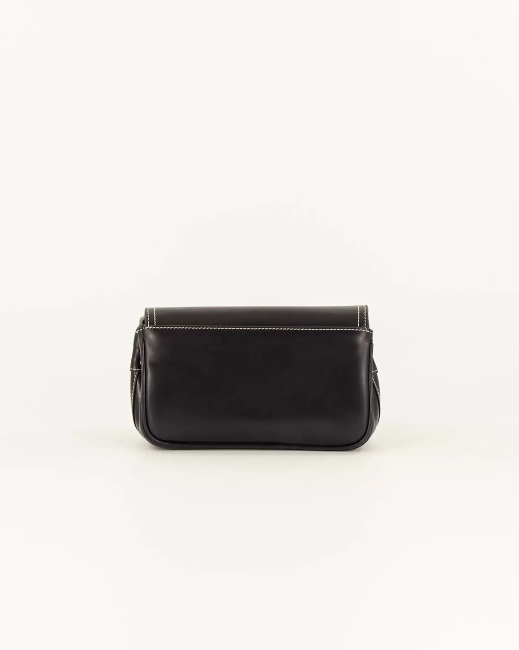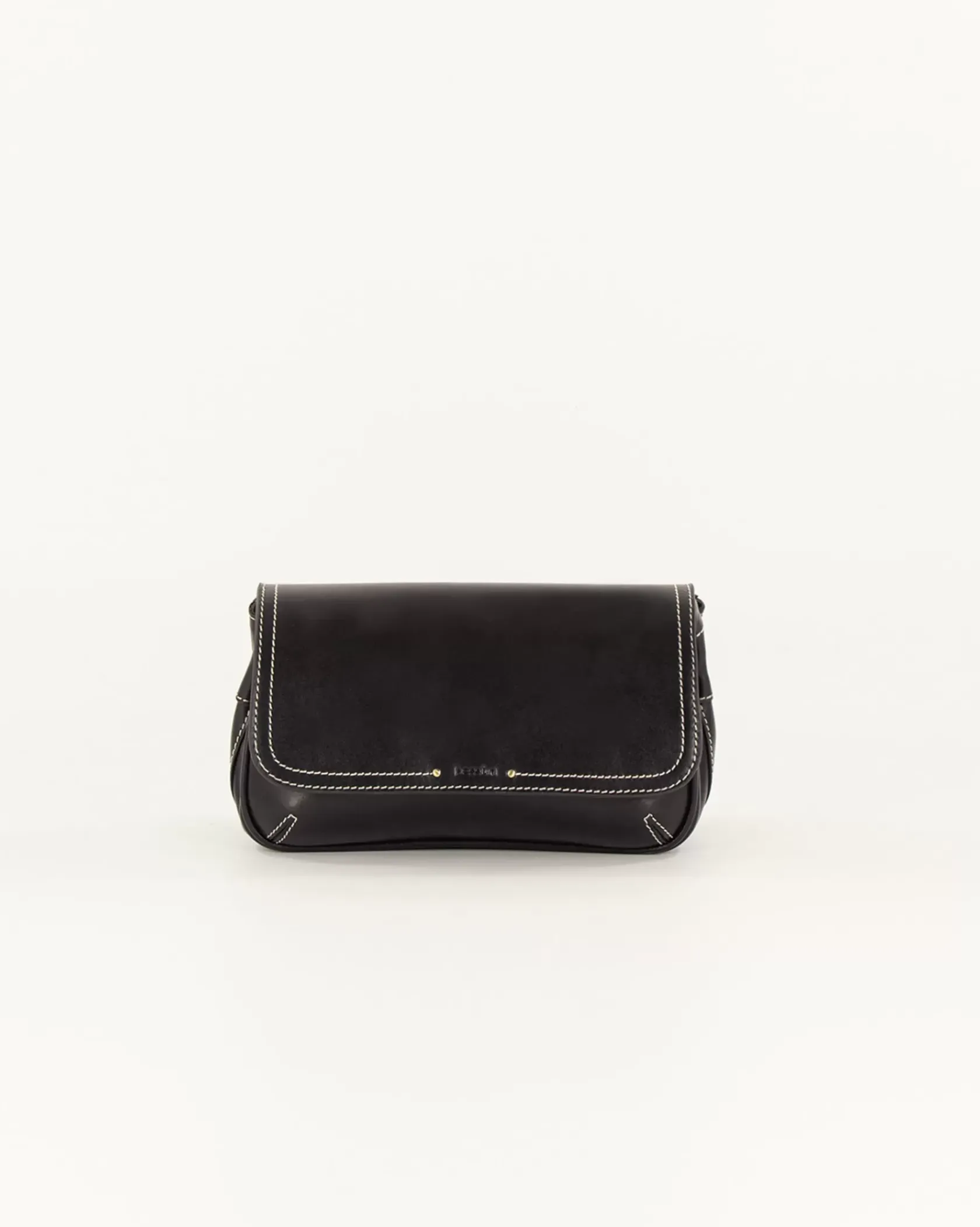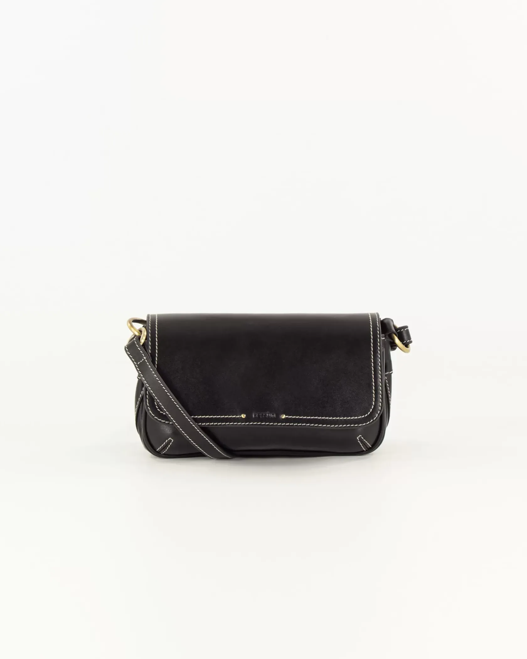 Sac baguette en cuir de vache avec fils de surpiqûres contrastés, bandoulière réglable.