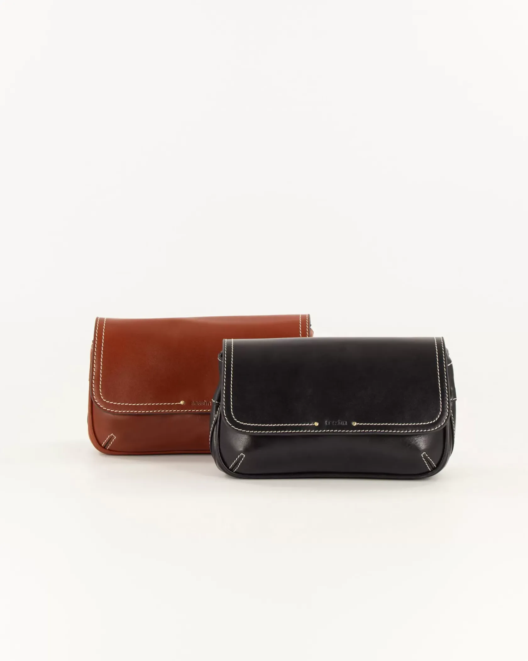 Sac baguette en cuir de vache avec fils de surpiqûres contrastés, bandoulière réglable.
