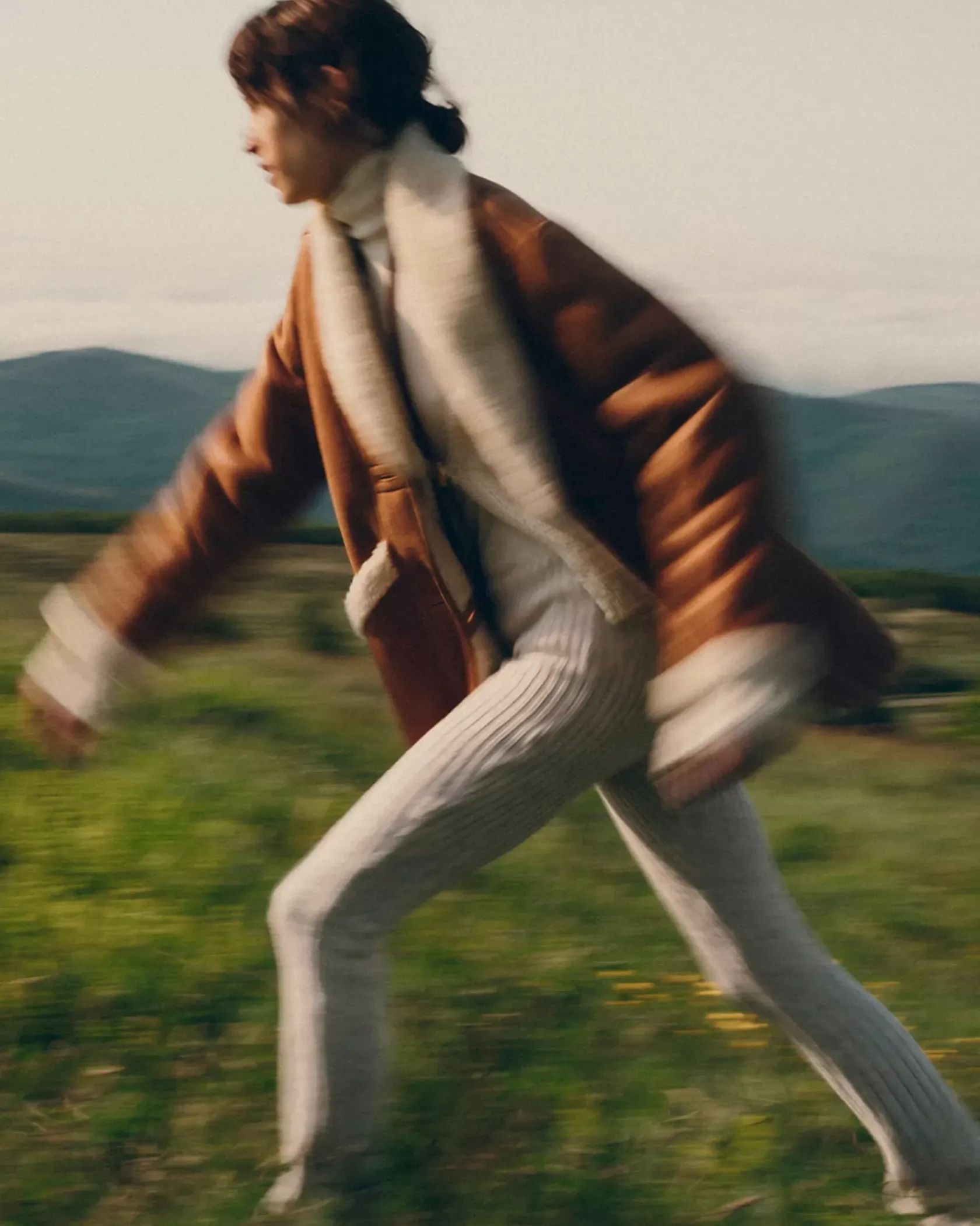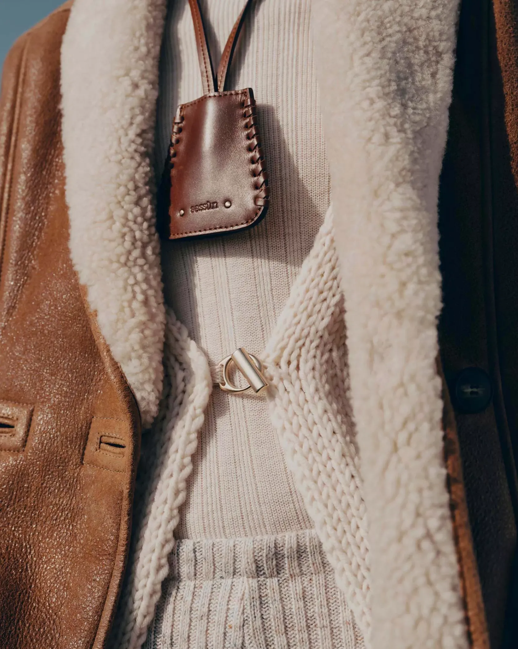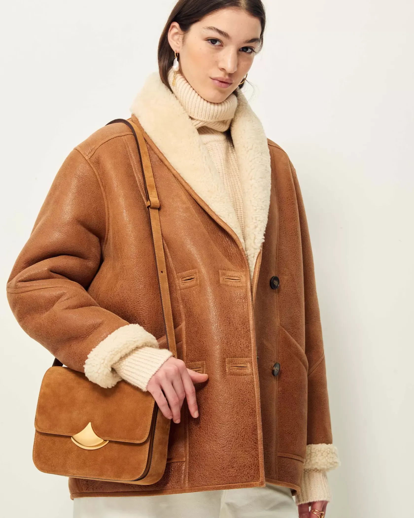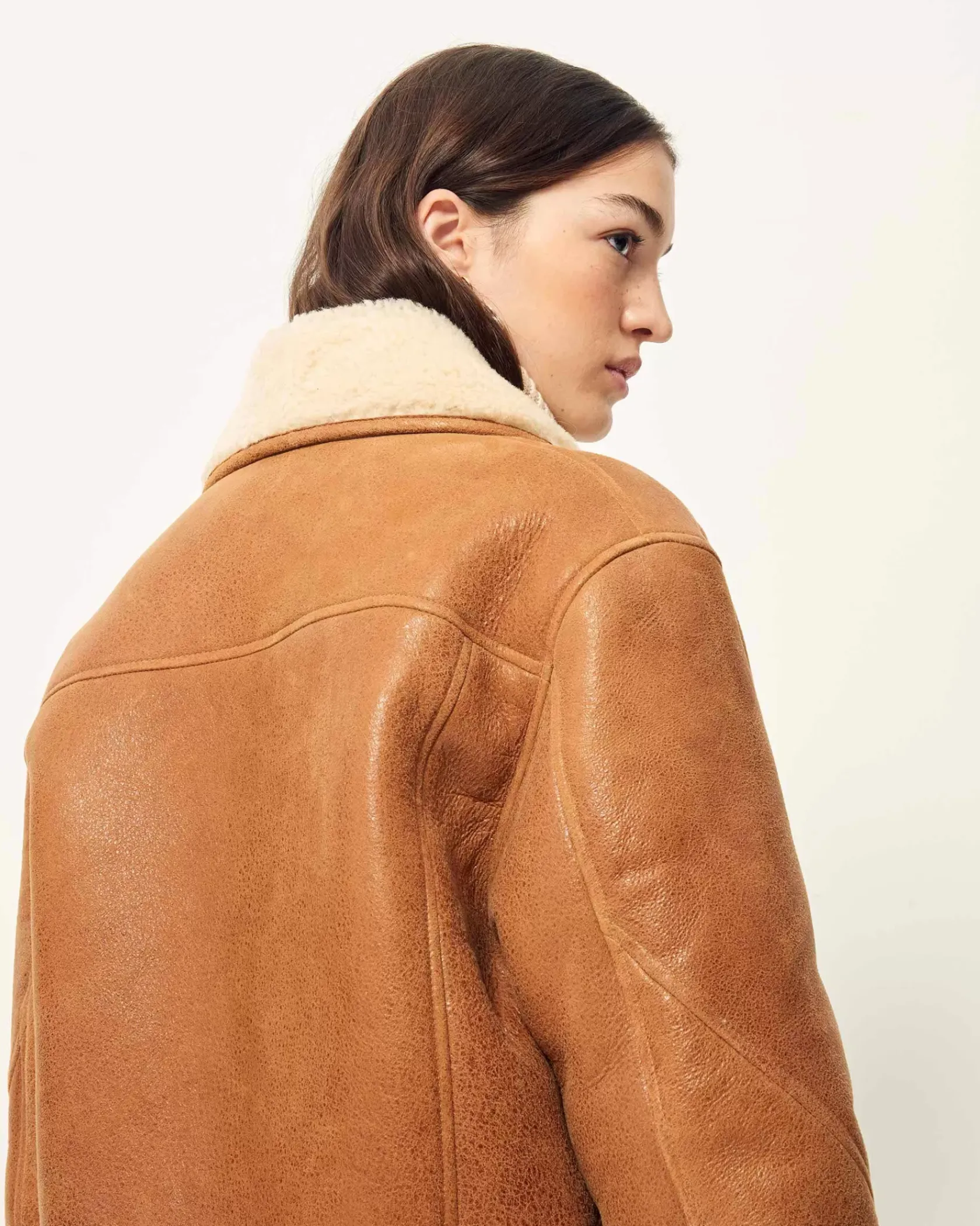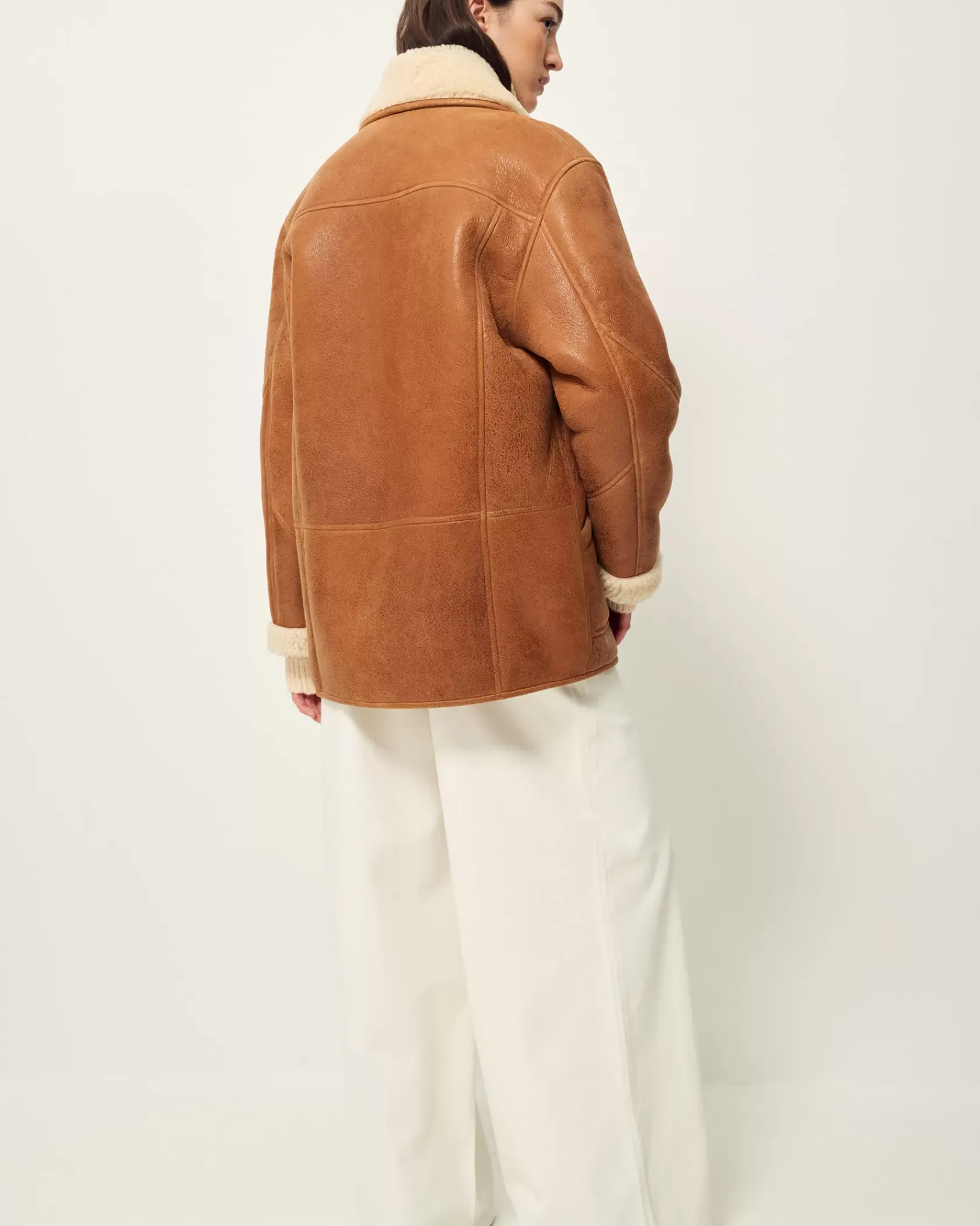 Manteau court esprit Canadienne en peau lainée de mouton, biais contrasté en cuir d’agneau à tannage végétal.