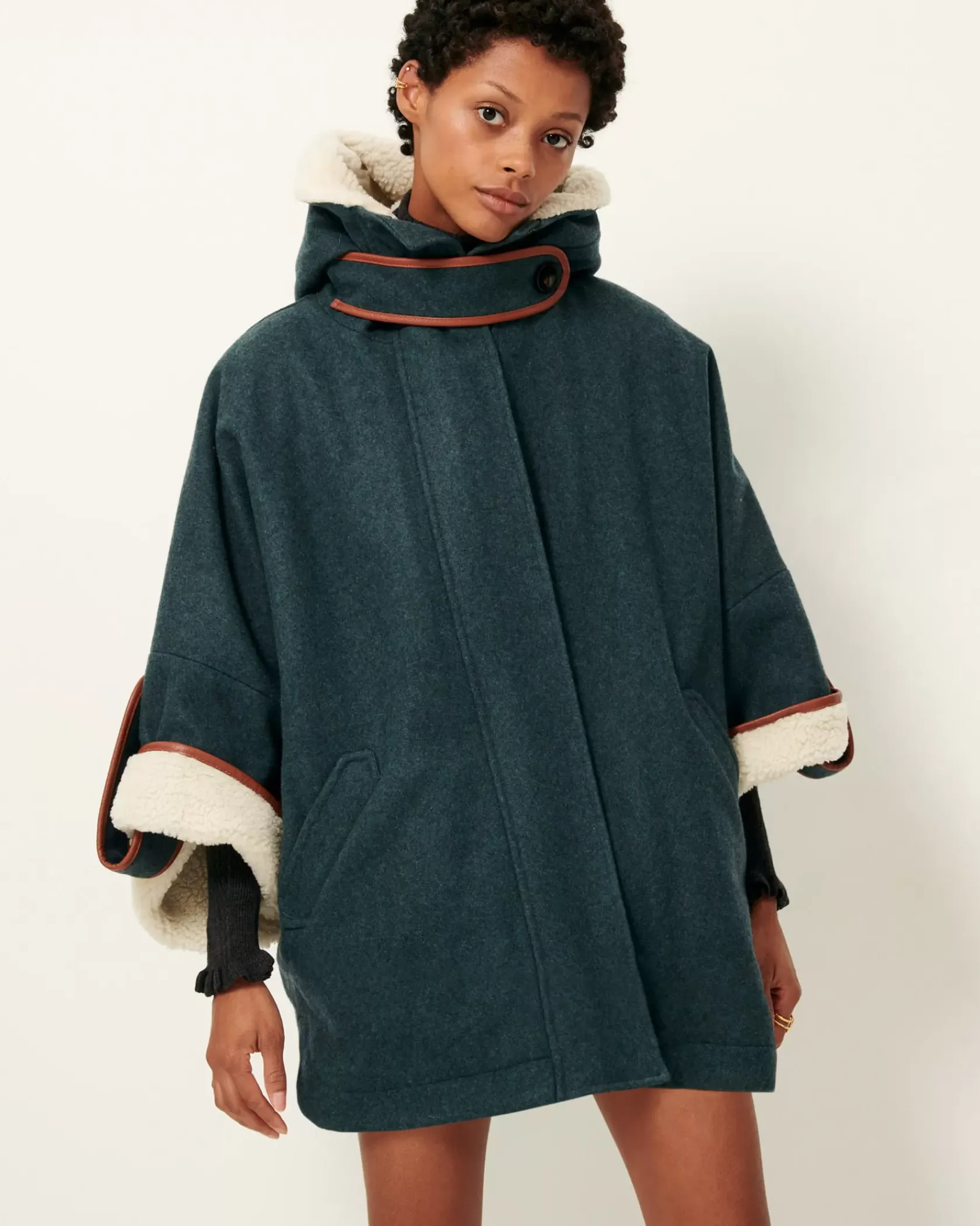 Cape ample en drap de laine, biais cuir contrastés en détail,