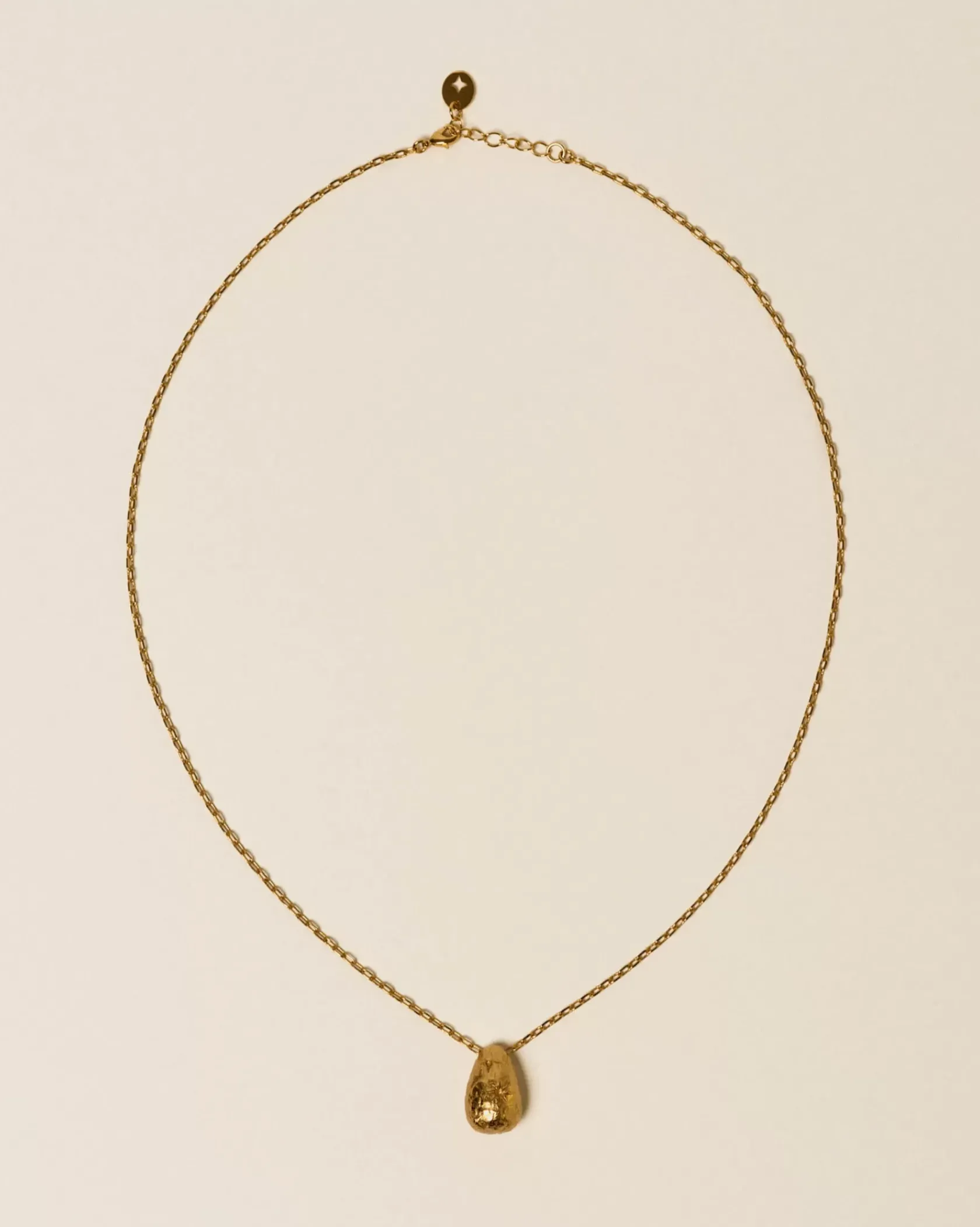 Collier pendentif en forme de goutte finition dorée avec effet matiéré et reliefs étoilés.