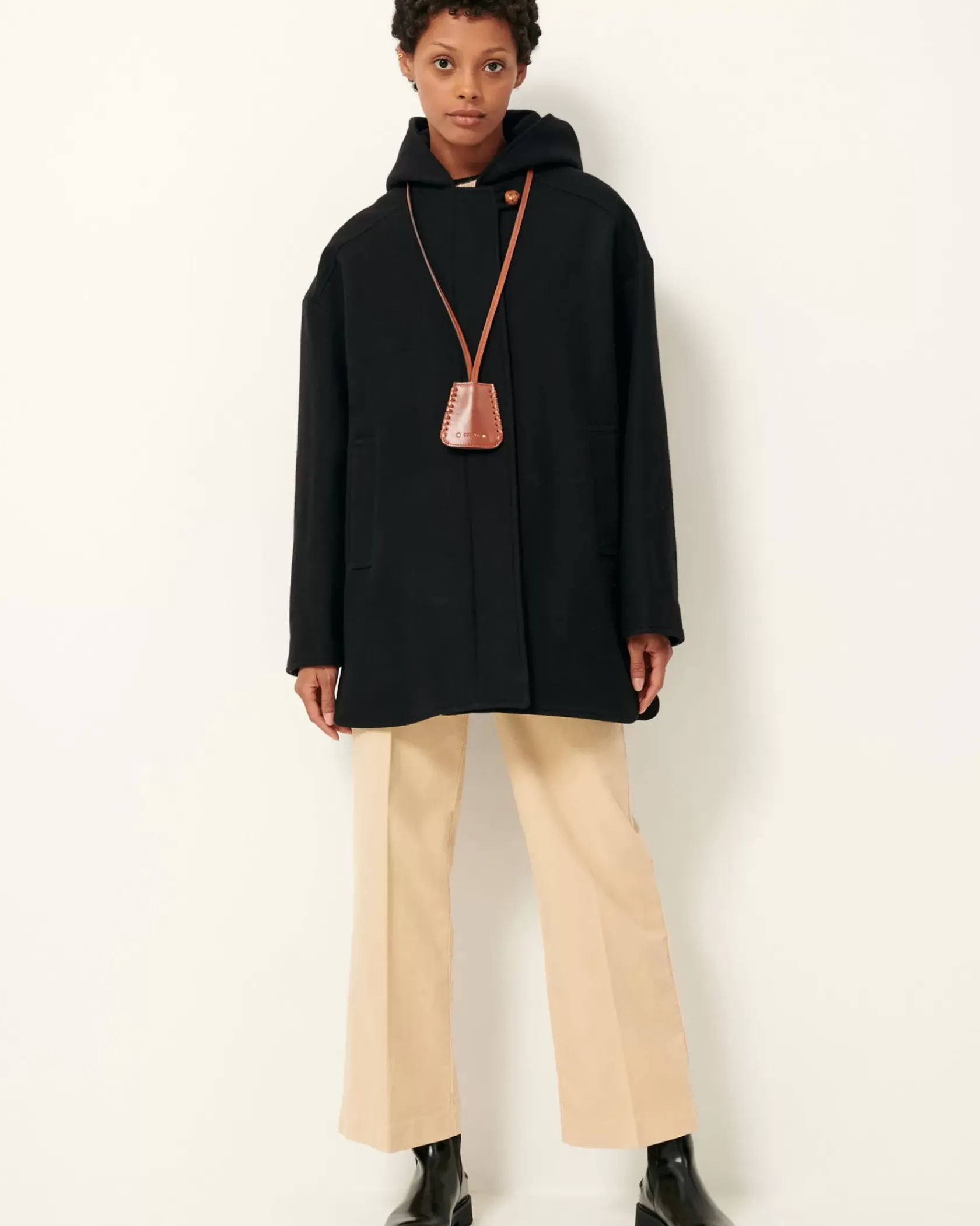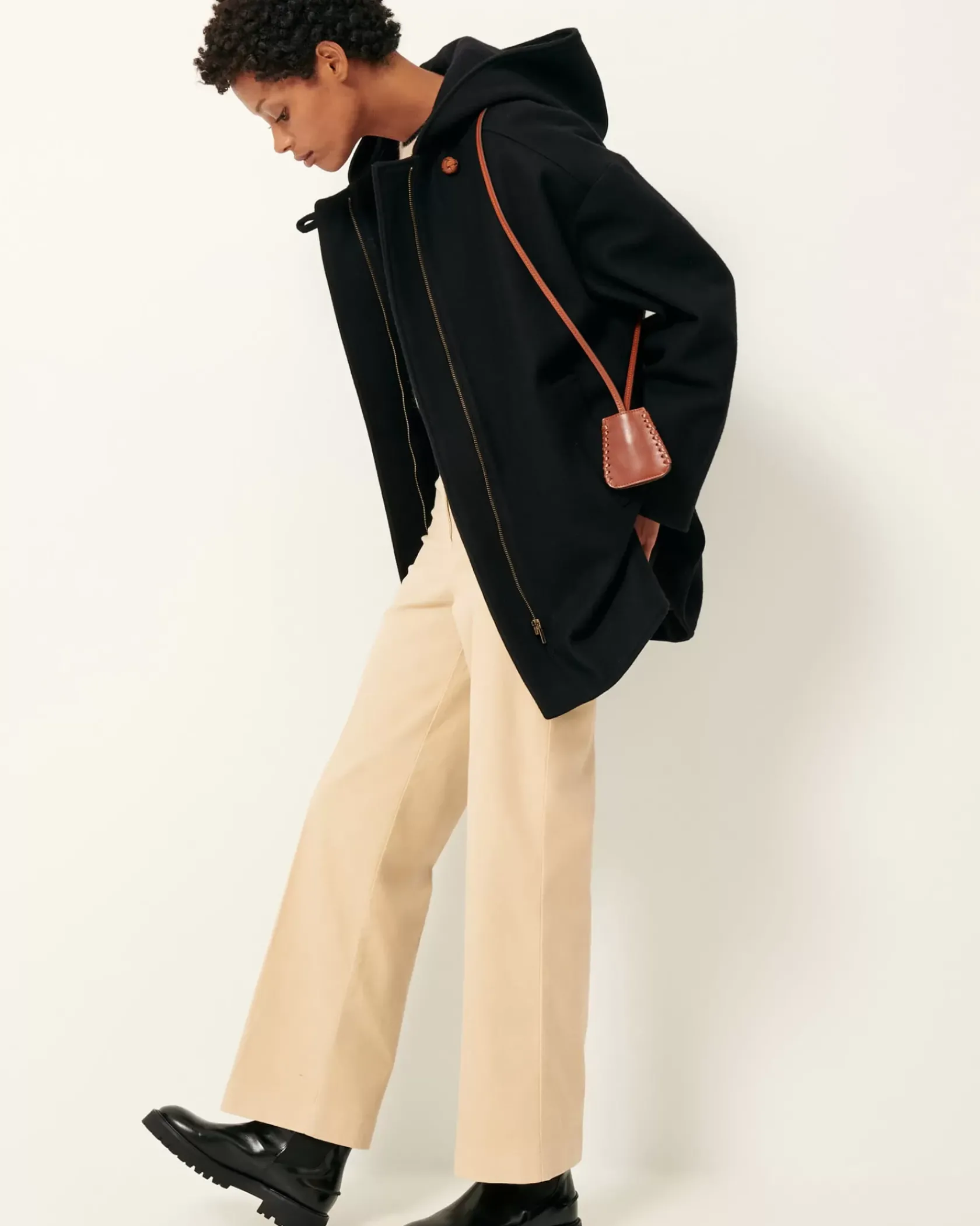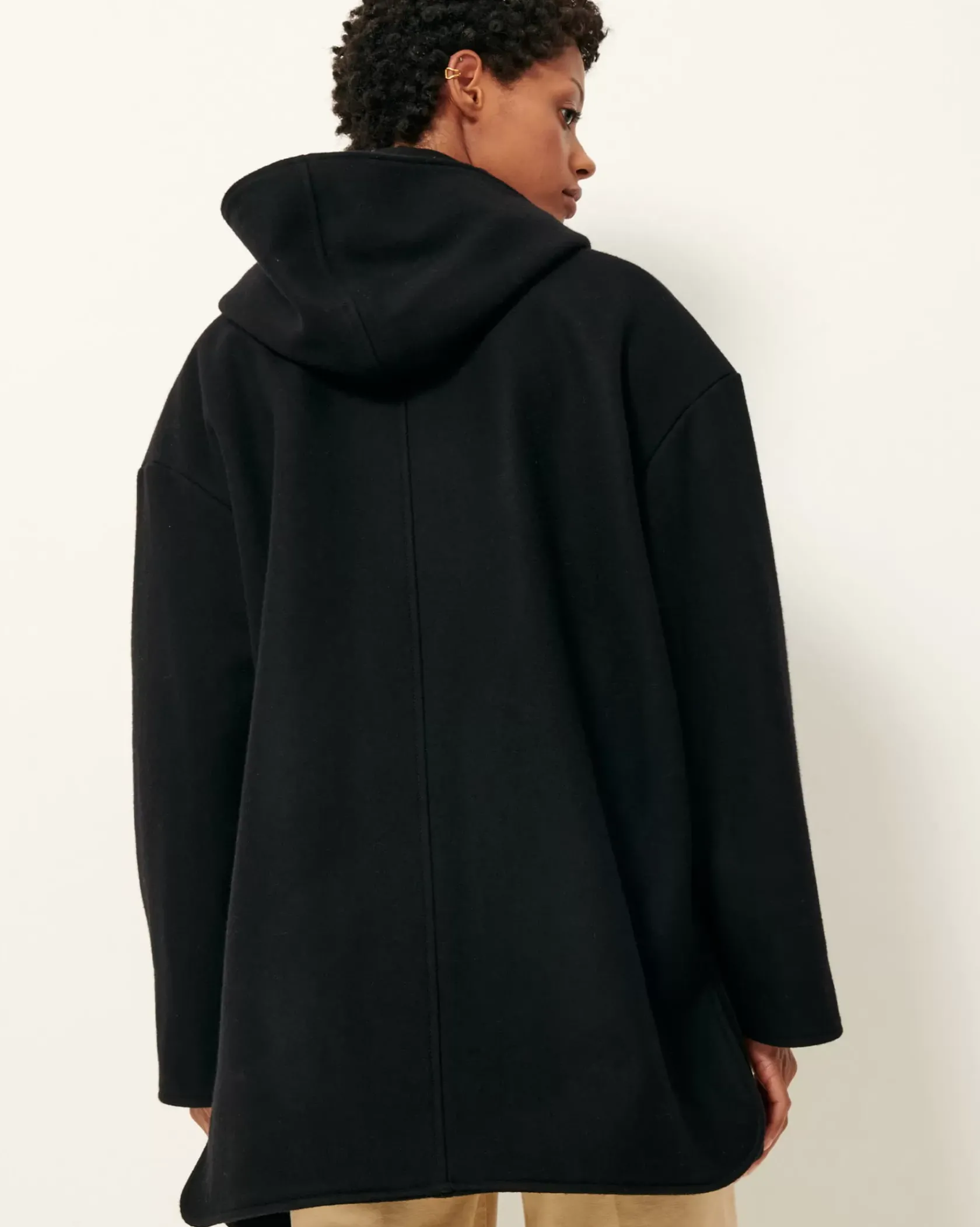 Manteau oversize à capuche en toile de coton organique enduite déperlante, tissée en Italie.