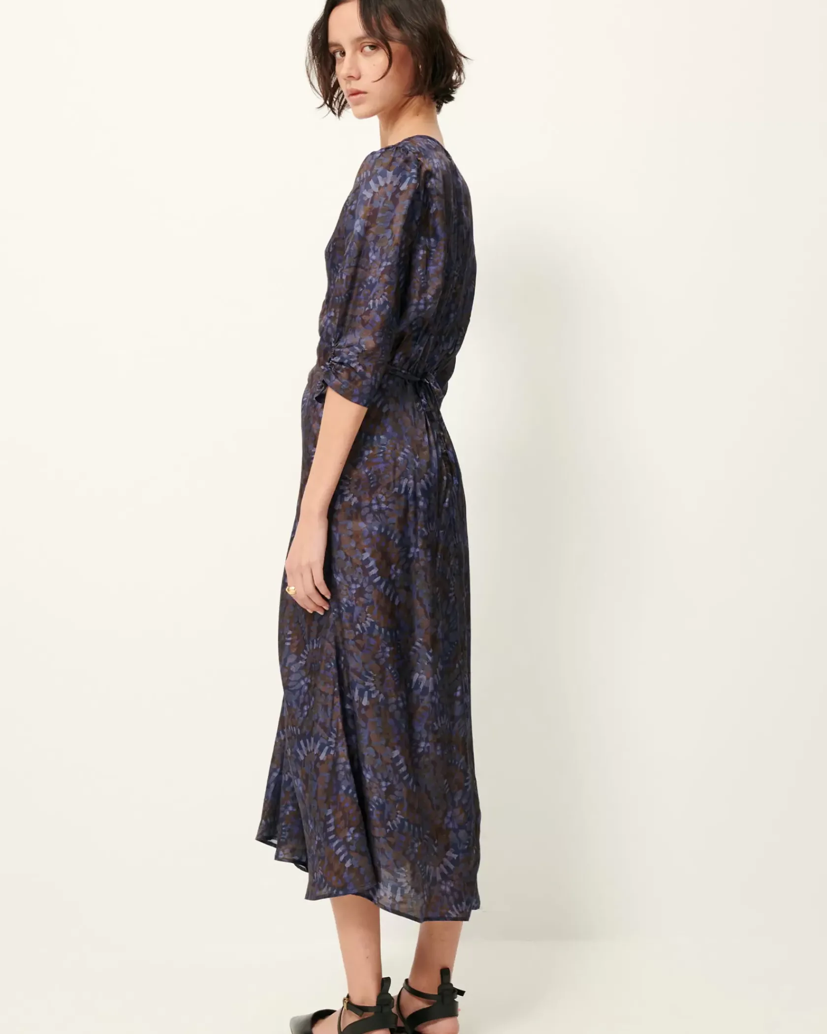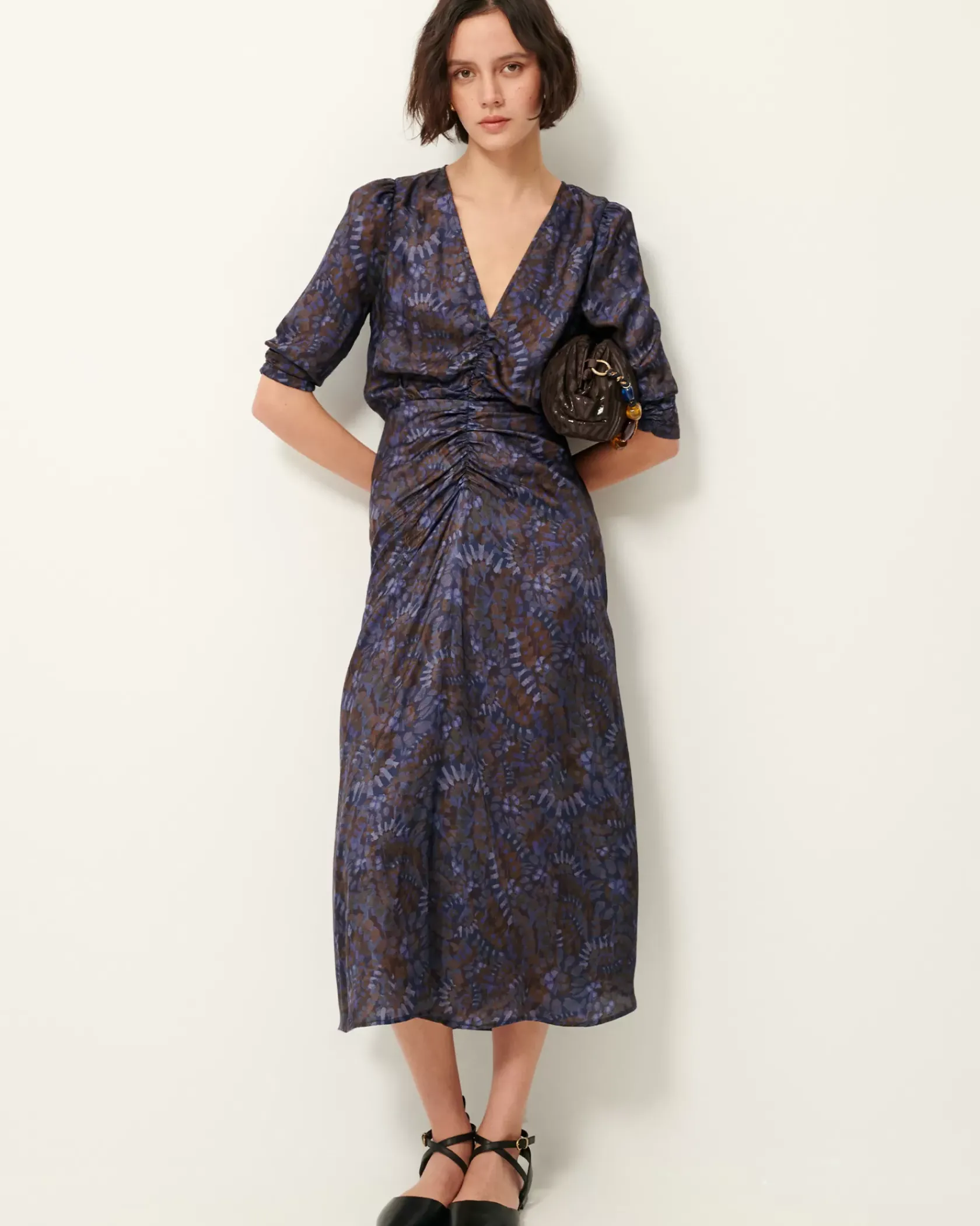 Robe longue décolletée avec détail de fronces et lien de resserrage à la taille en satin de viscose fluide imprimé, motif exclusif Sessùn, apprêté en Italie.