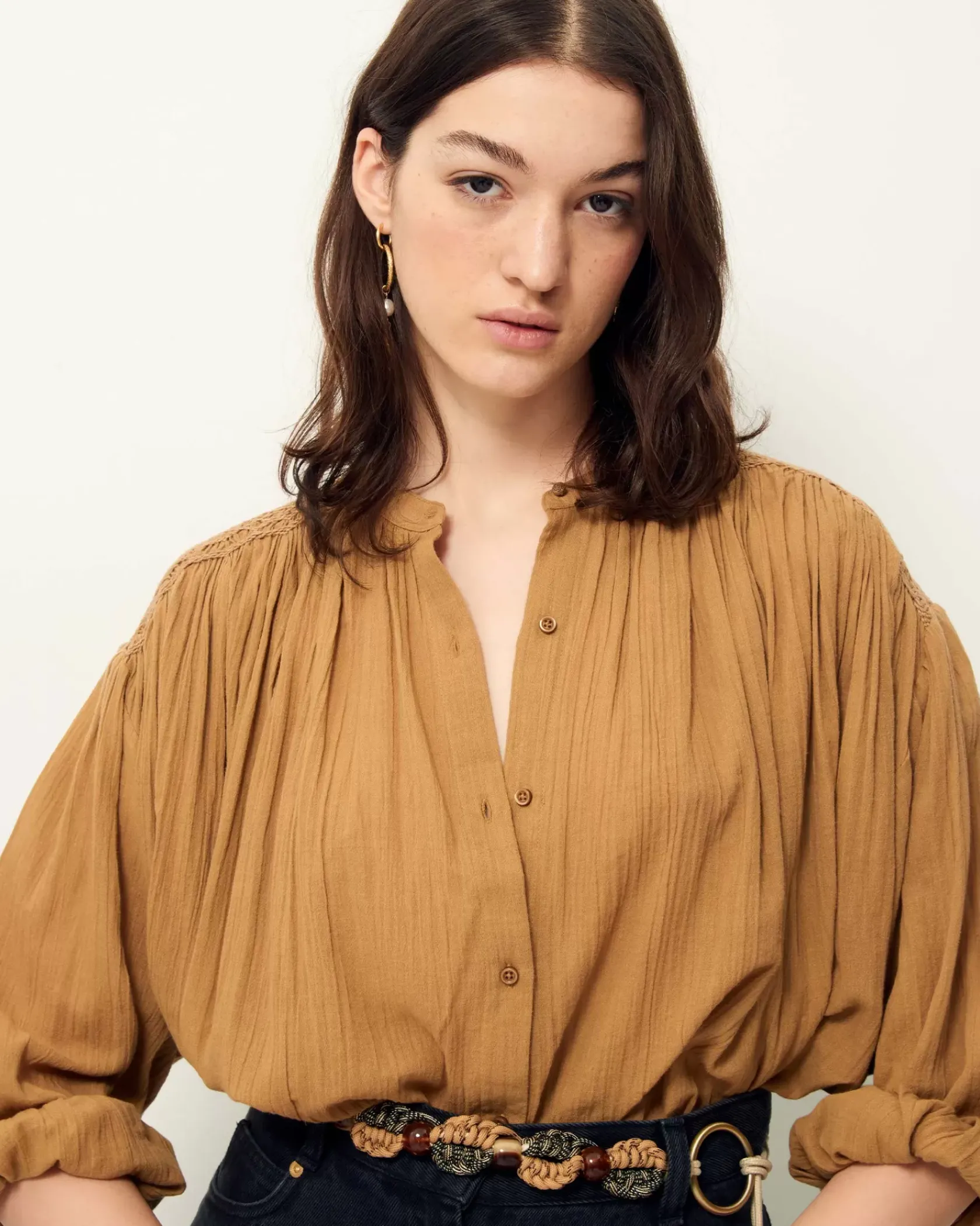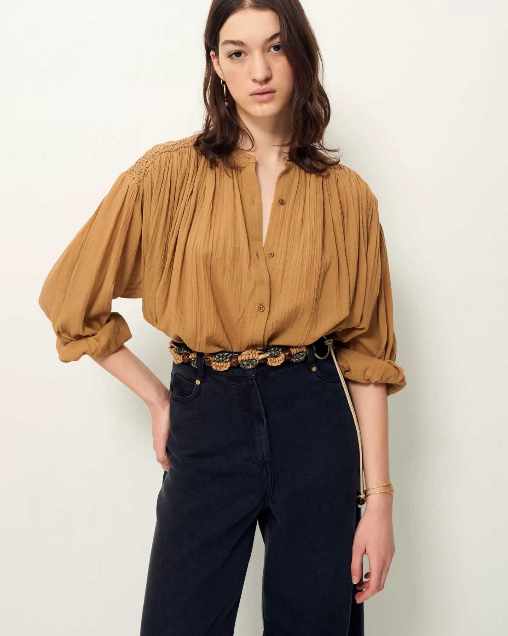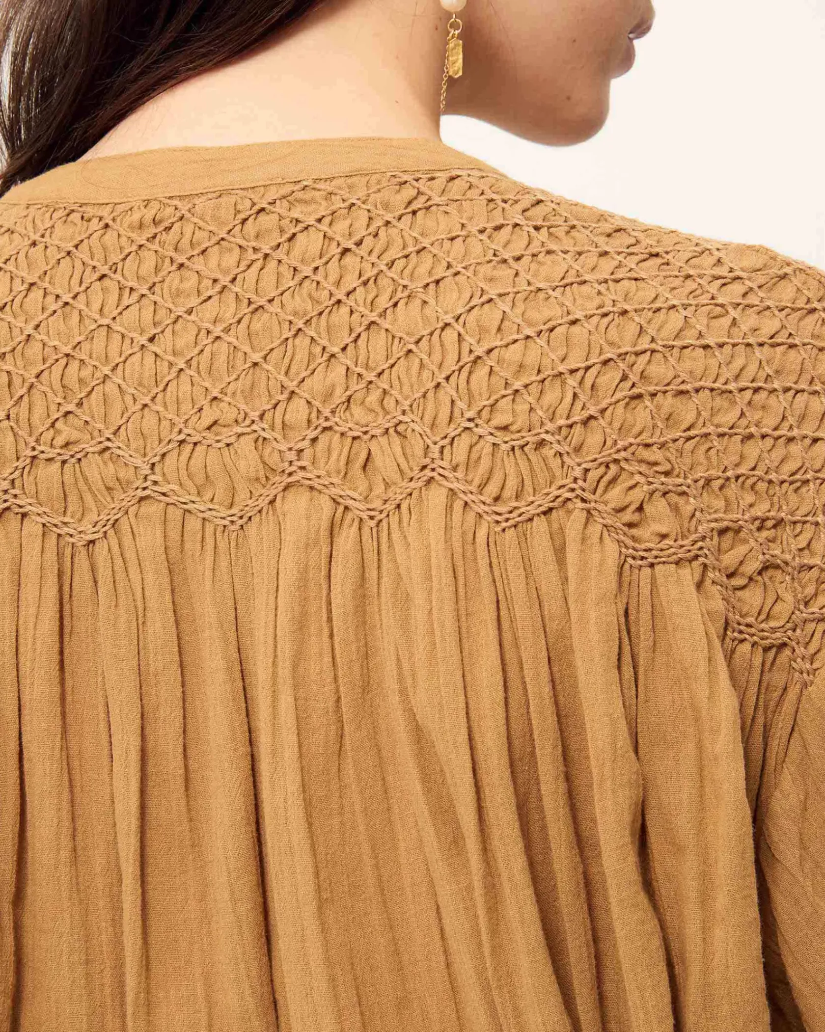 Blouse ample smockée aux épaules et au dos en voile antique de coton.