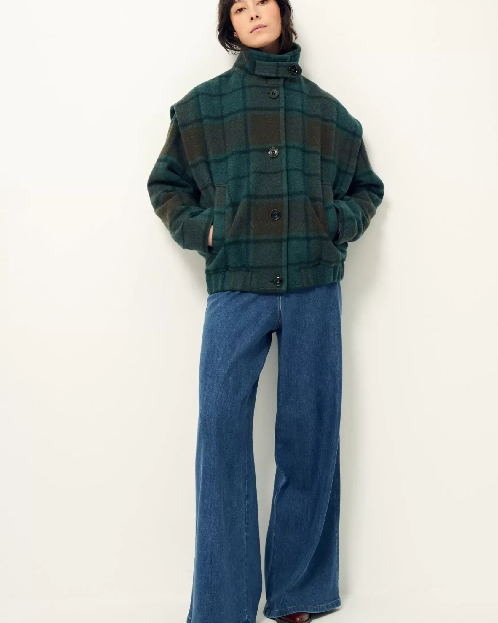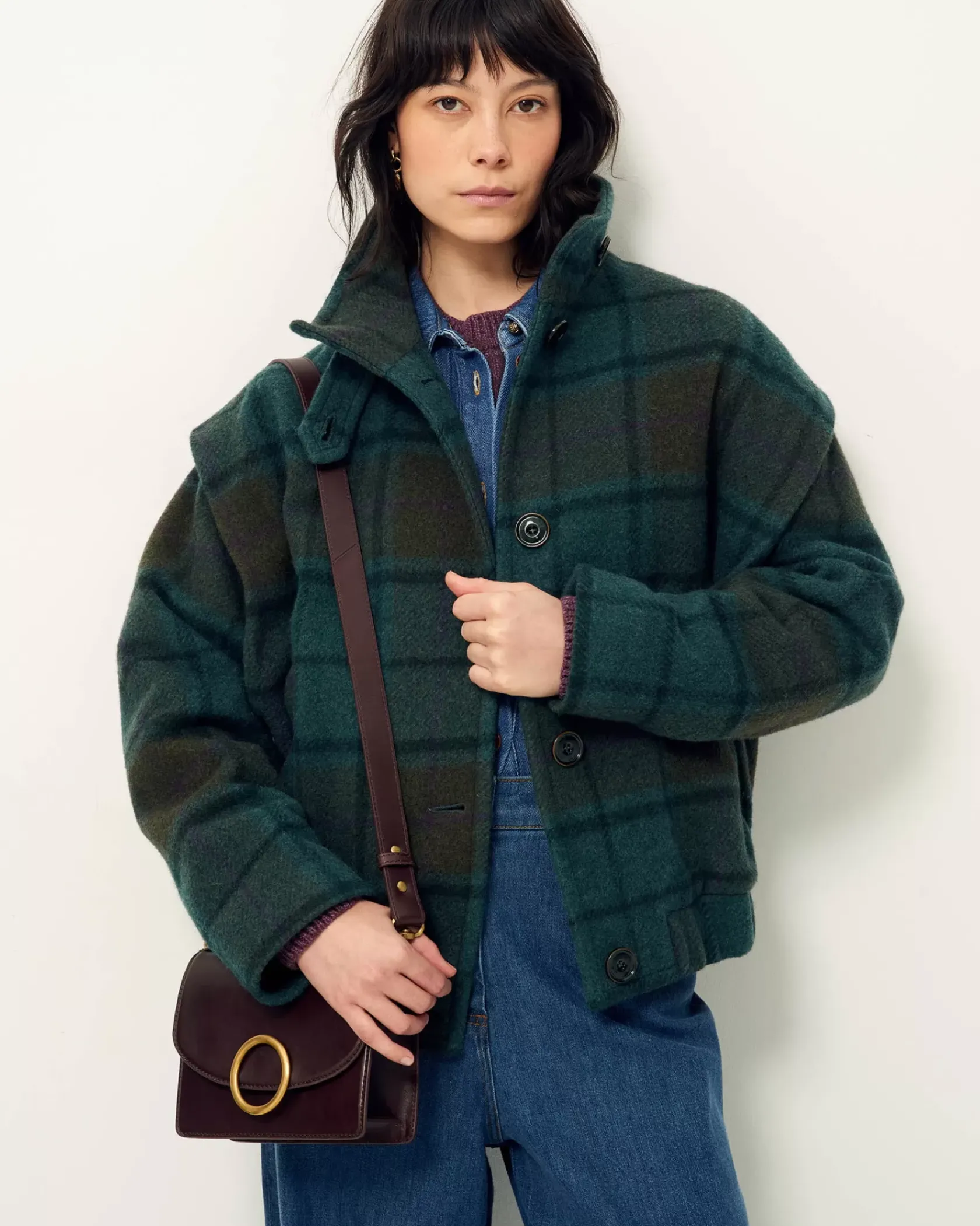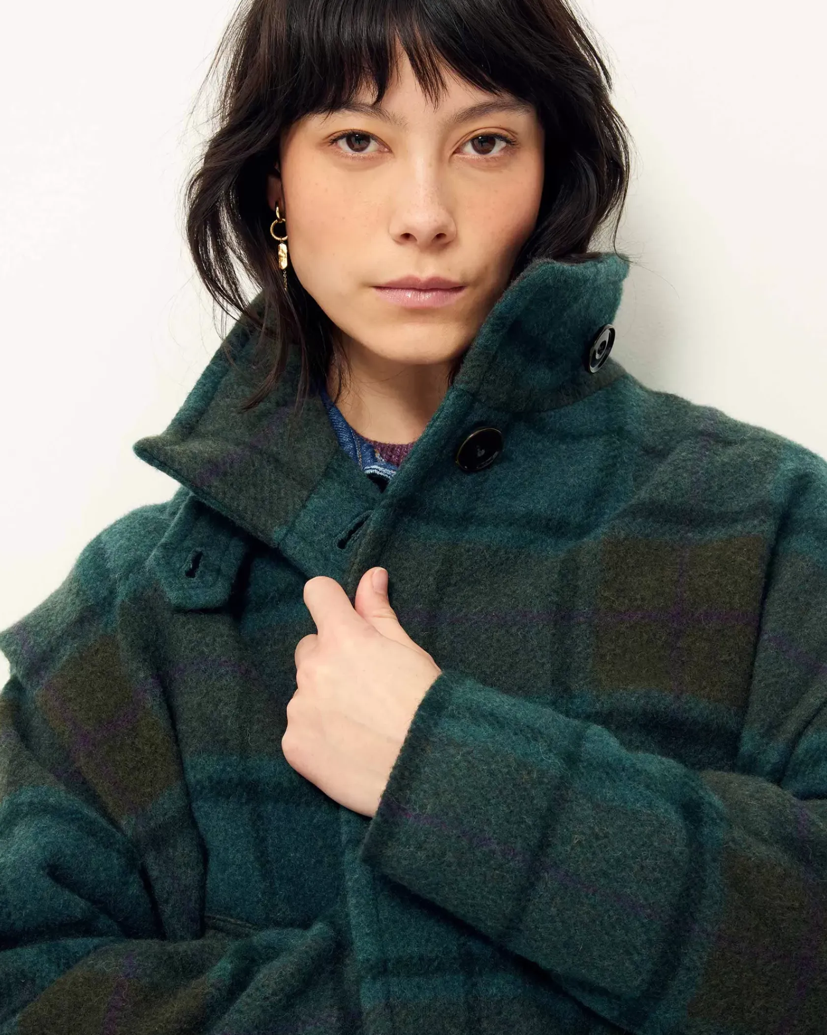Veste courte esprit blouson à plis sur l’épaule et taille élastiquée en tartan double tissage finition velvet, tissé en Italie.