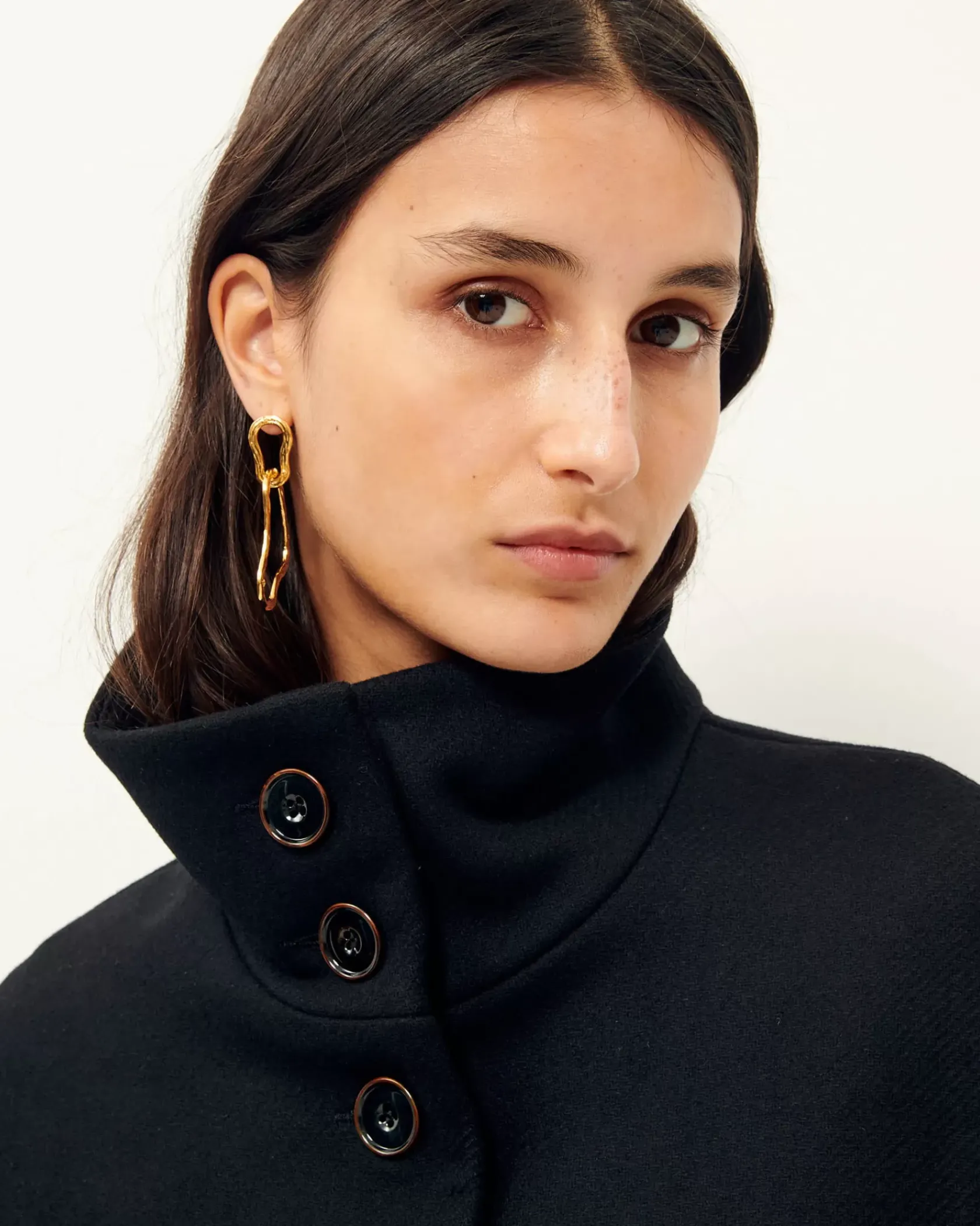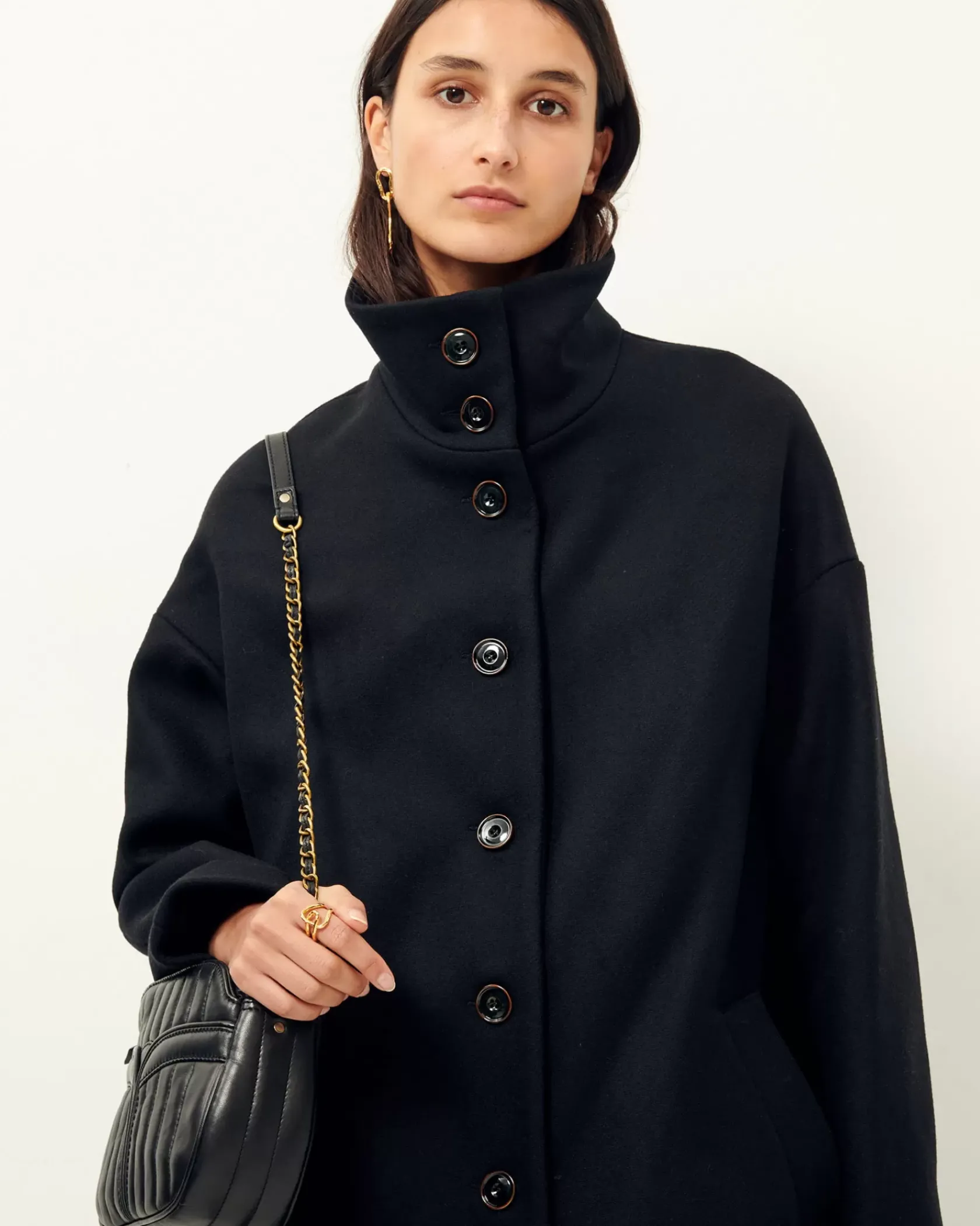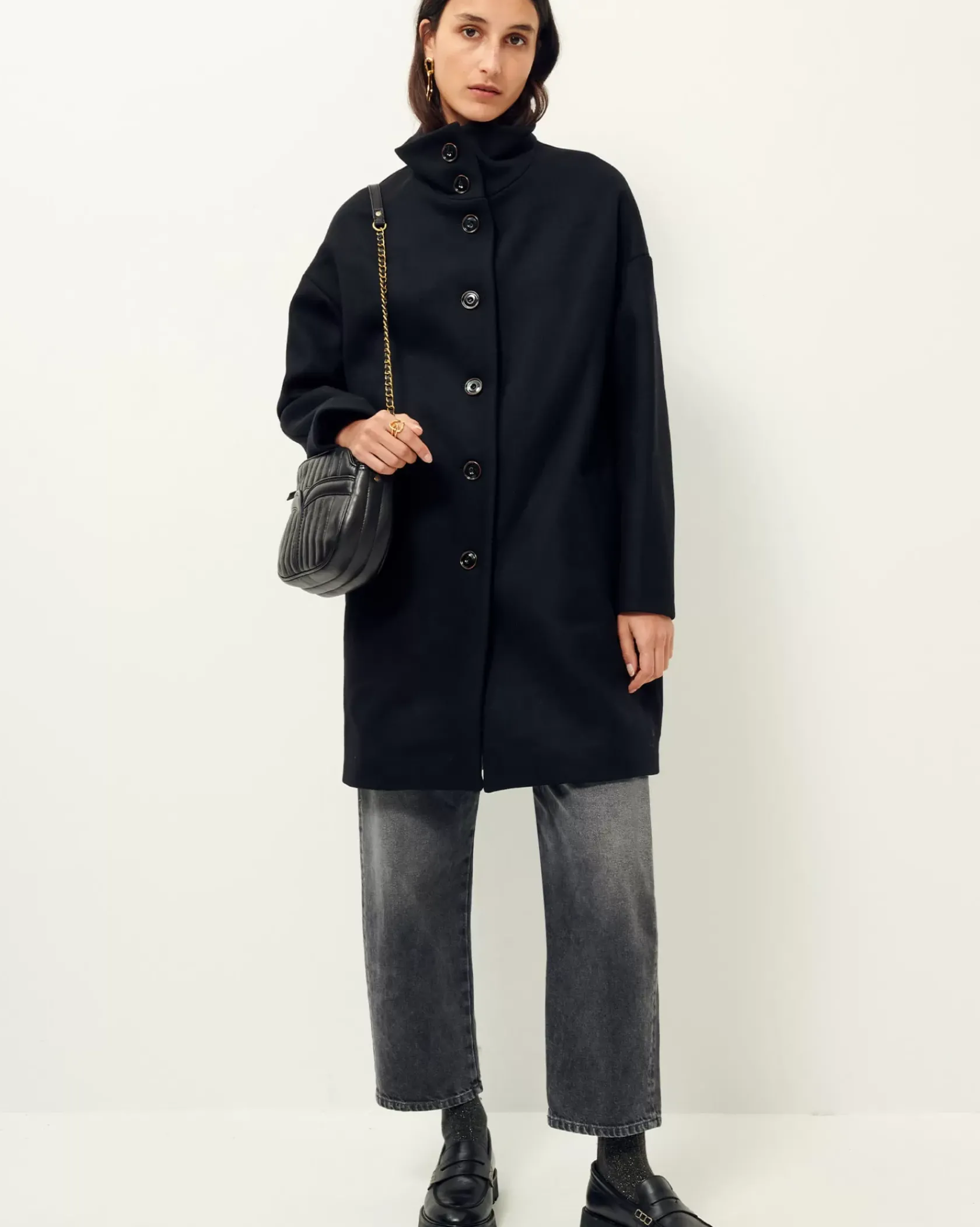 Manteau droit mi long à col montant en double tissage armuré chiné tissé en Italie.