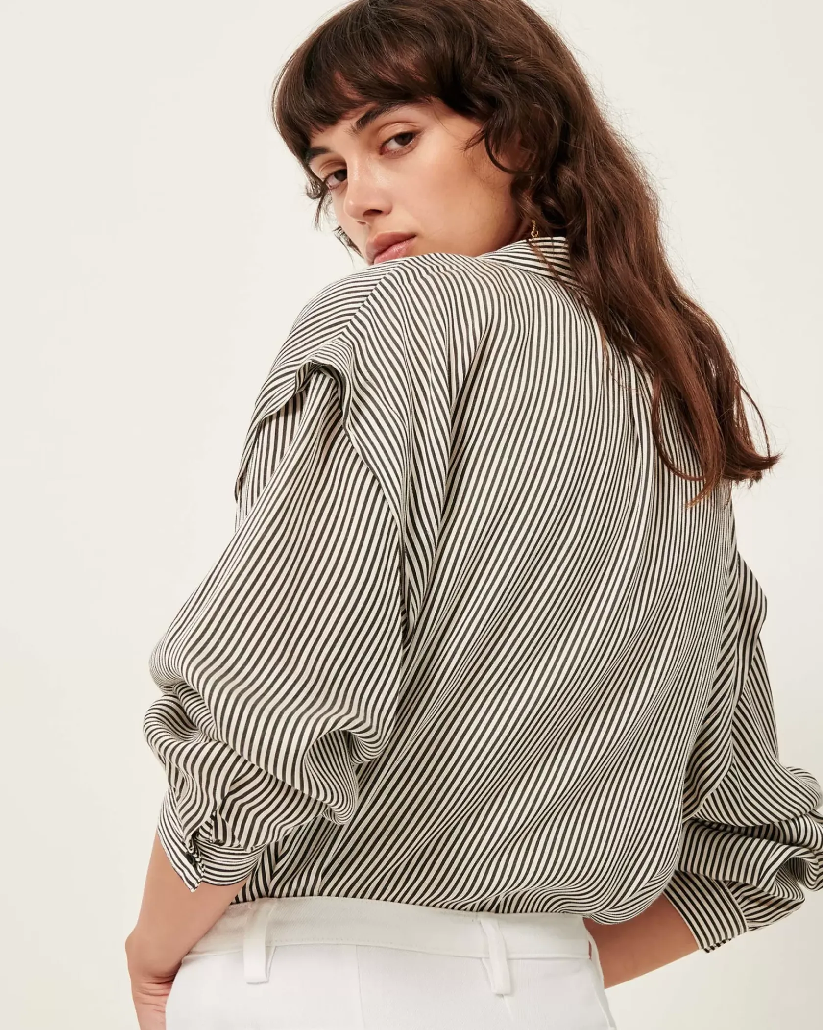 Chemise ample avec détail de pli plat sur les côtés en jacquard dobby de viscose soie rayé bicolore tissé en Italie.