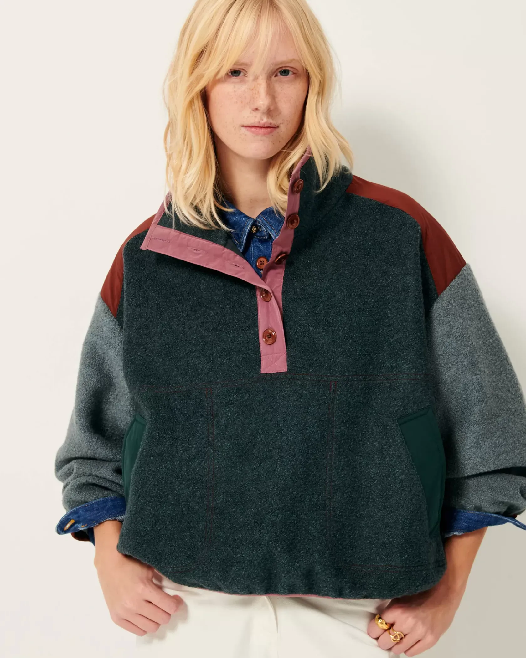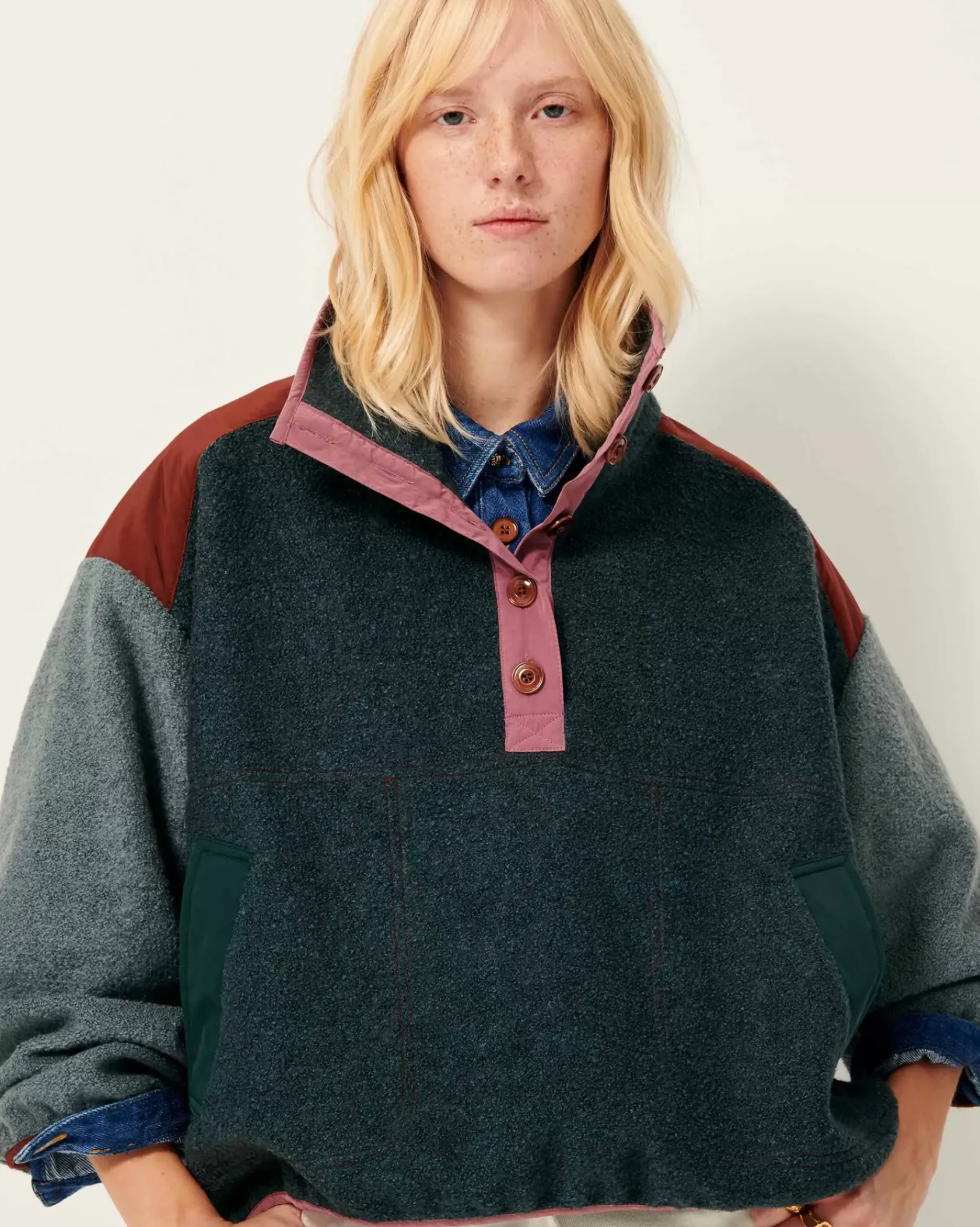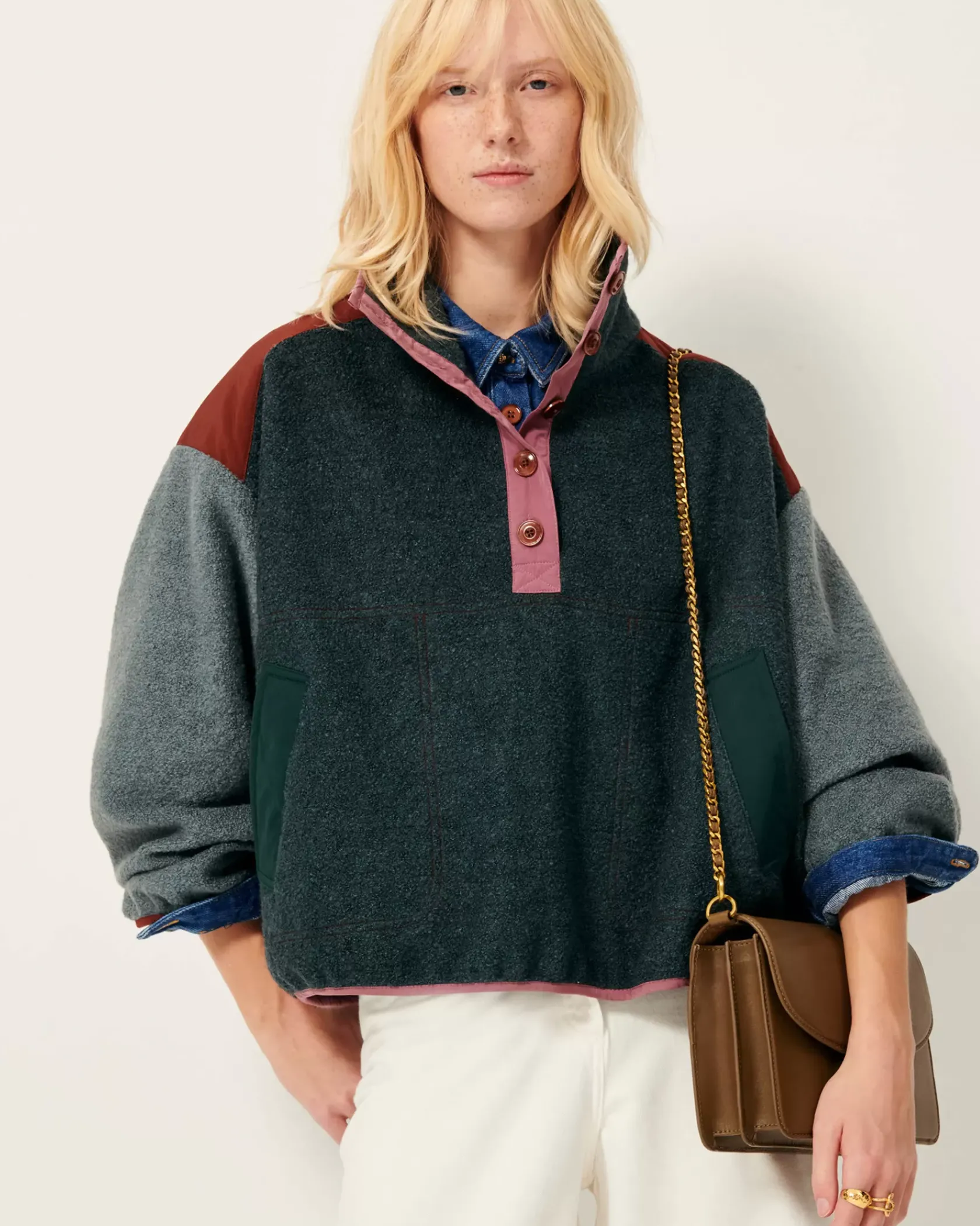 Sweat esprit vareuse à patte boutonnée en double tissage de fils bouclette, avec empiècements en gabardine contrastée.