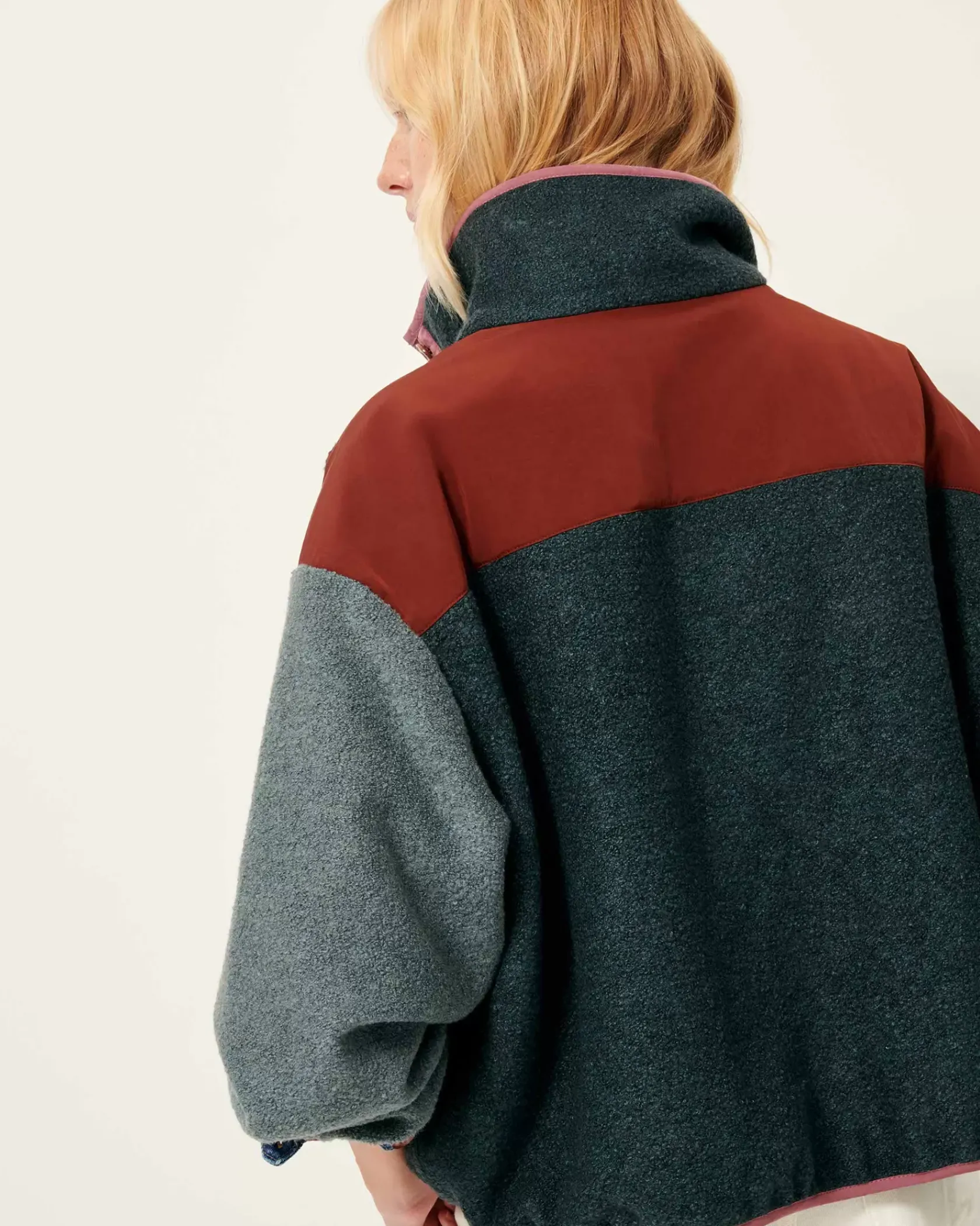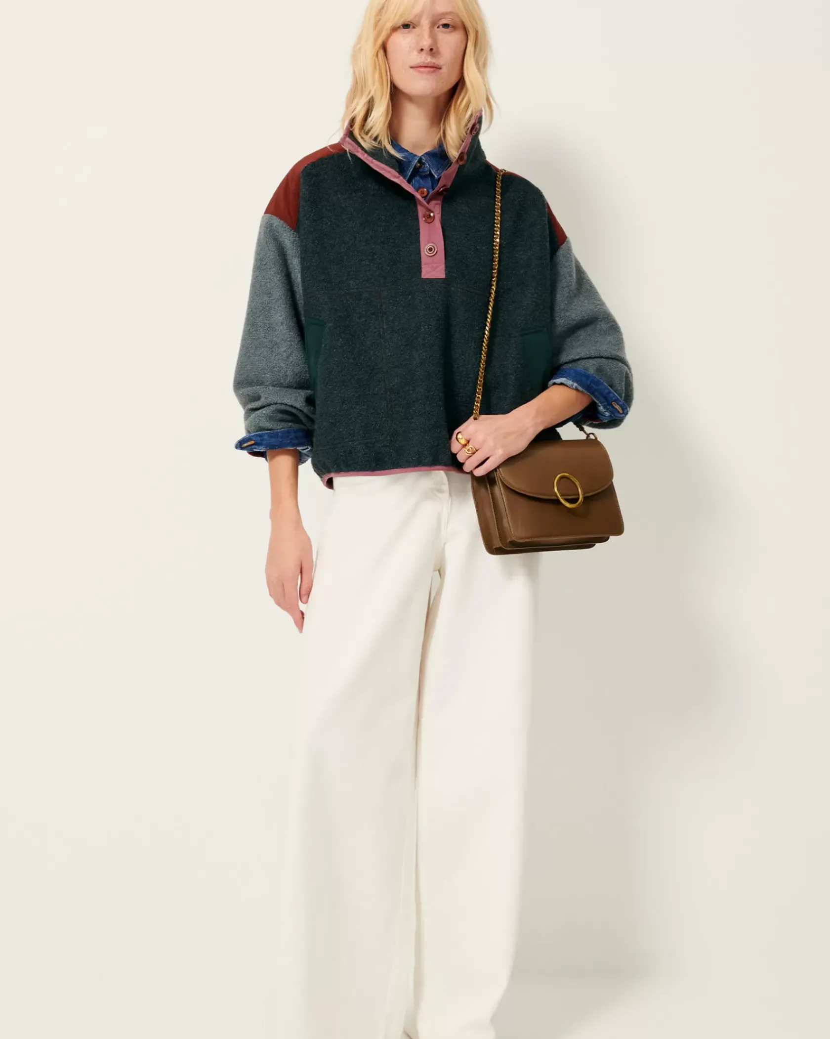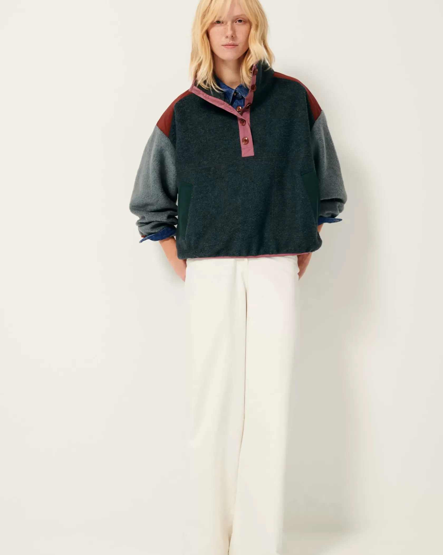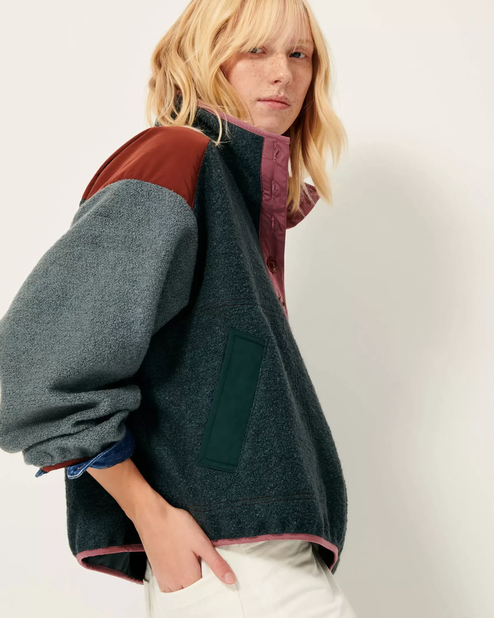Sweat esprit vareuse à patte boutonnée en double tissage de fils bouclette, avec empiècements en gabardine contrastée.