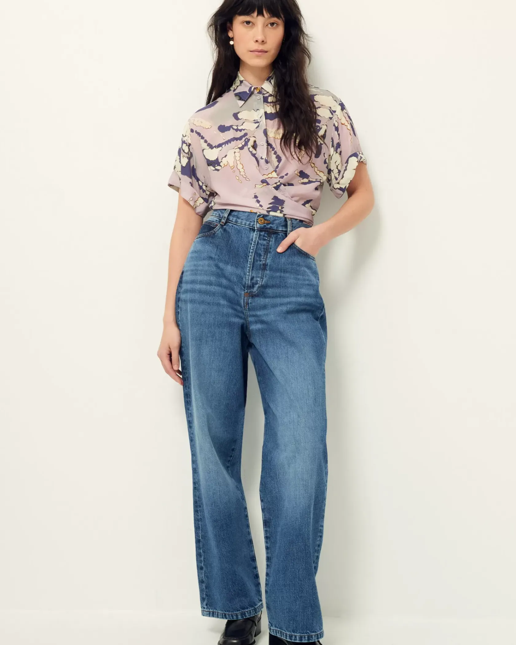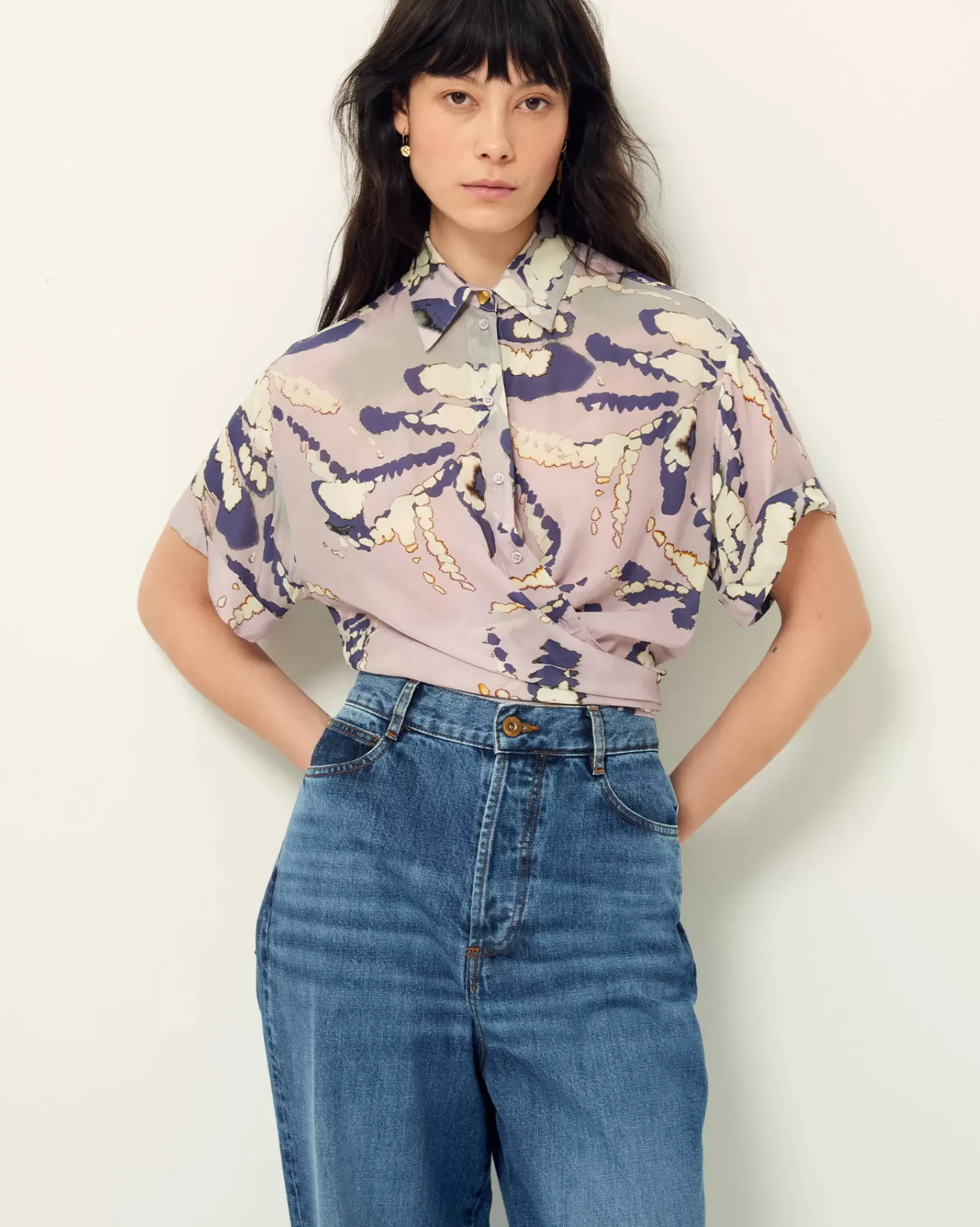 Chemisier court à nouer en toile de viscose fluide et aérienne imprimée et apprêtée en Italie, motif exclusif Sessùn.