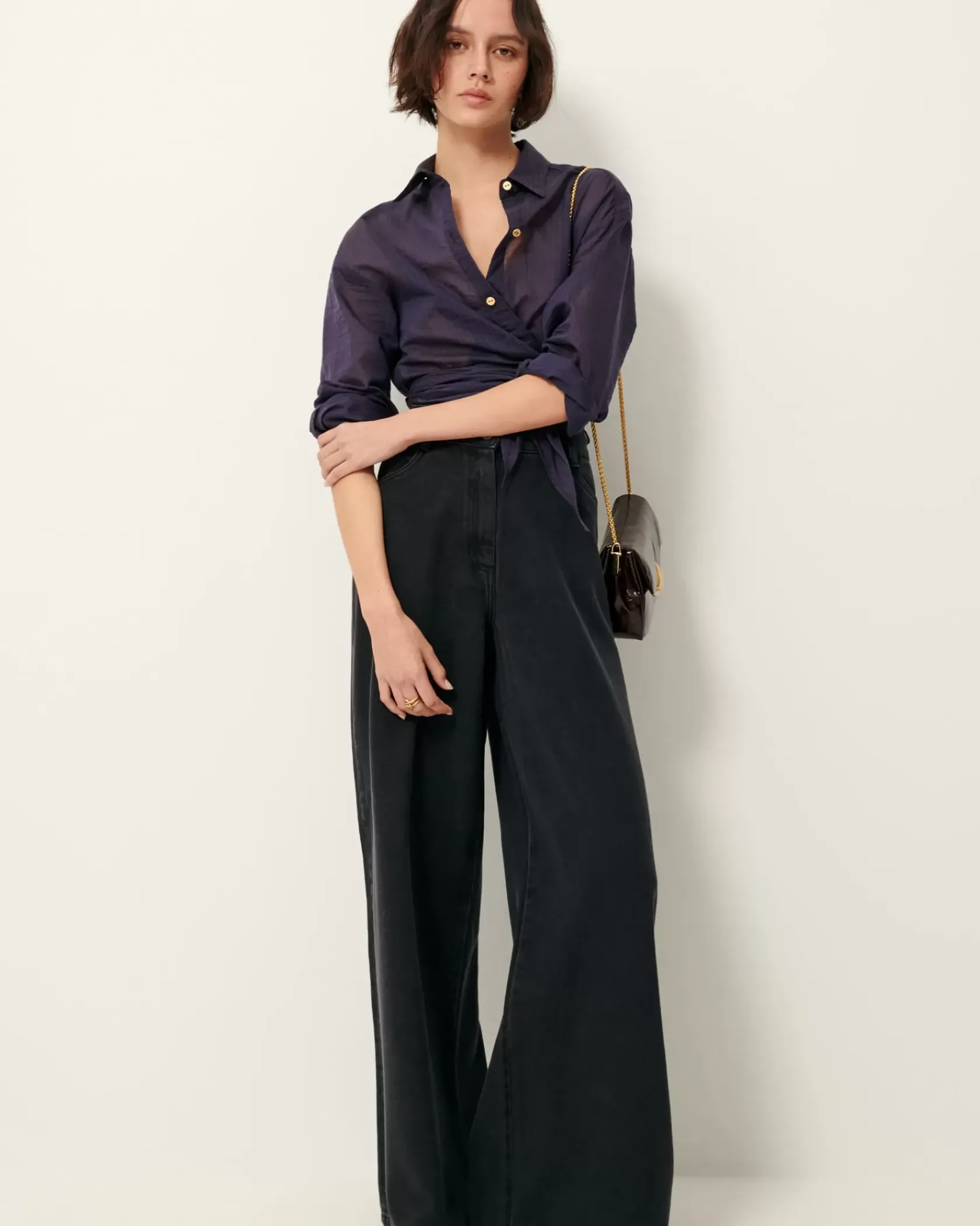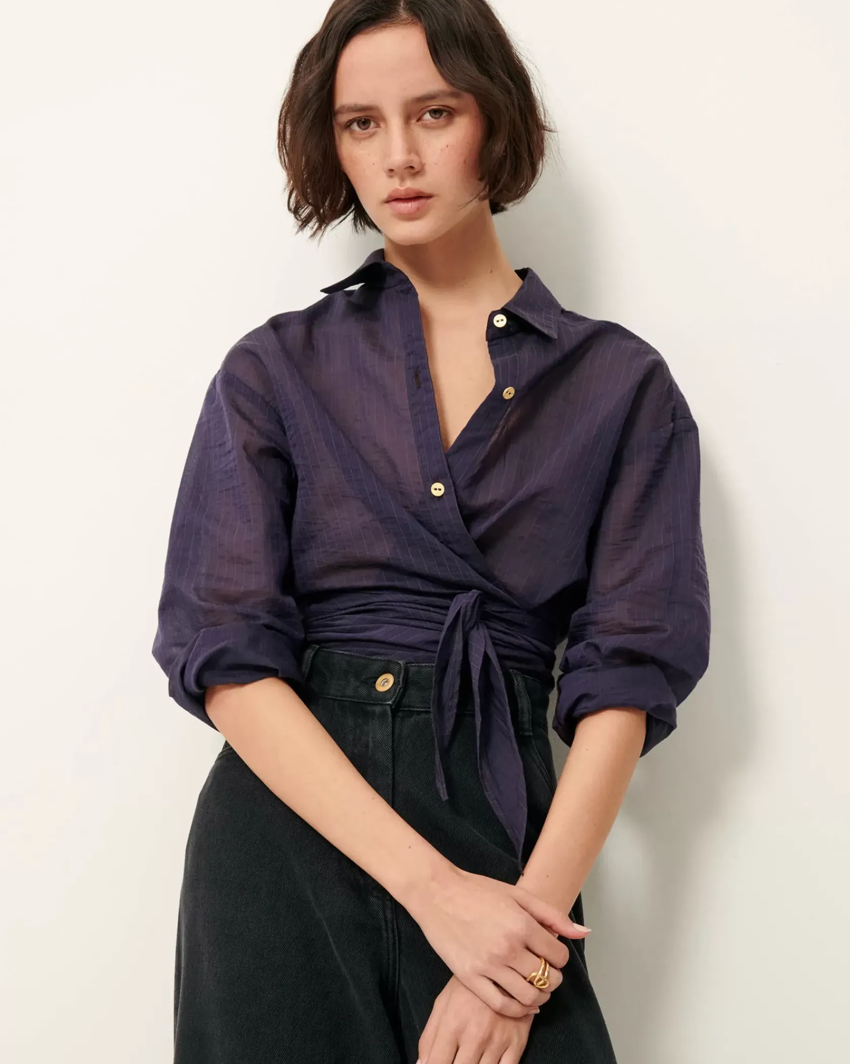 Chemise à nouer manches longues, voile transparent à fine rayure zephyr, tissé en Italie.