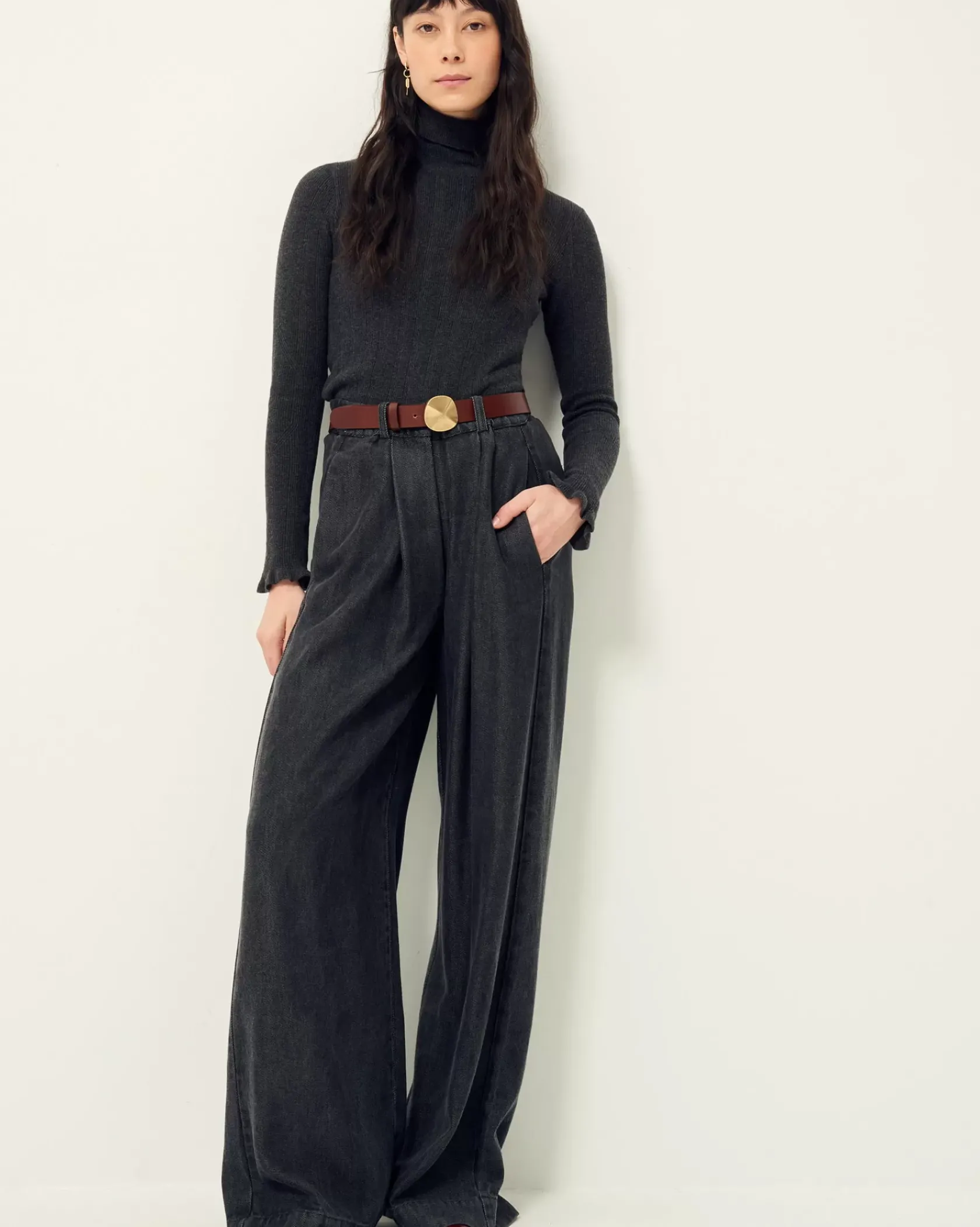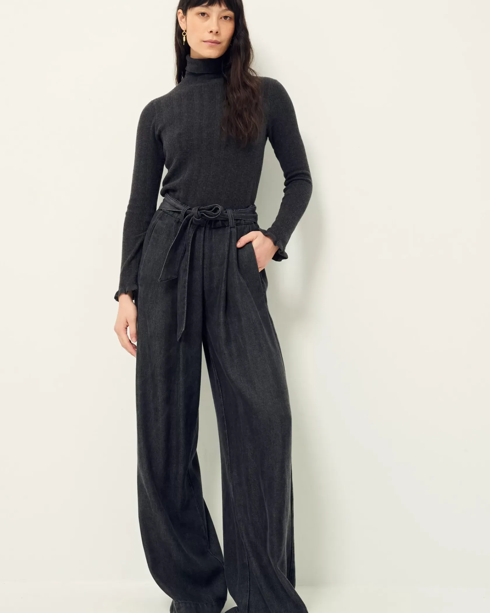 Pantalon ample taille haute élastiquée et ceinture amovible à nouer en toile denim de lyocell fluide tissée en Espagne.