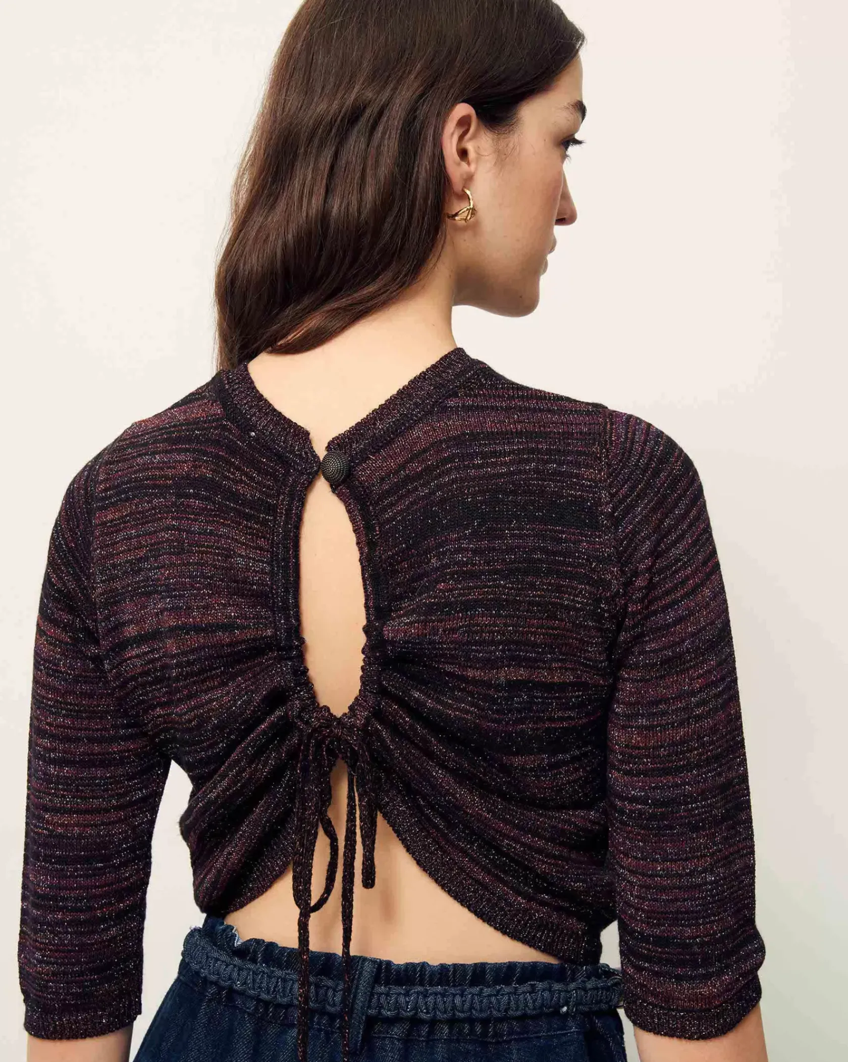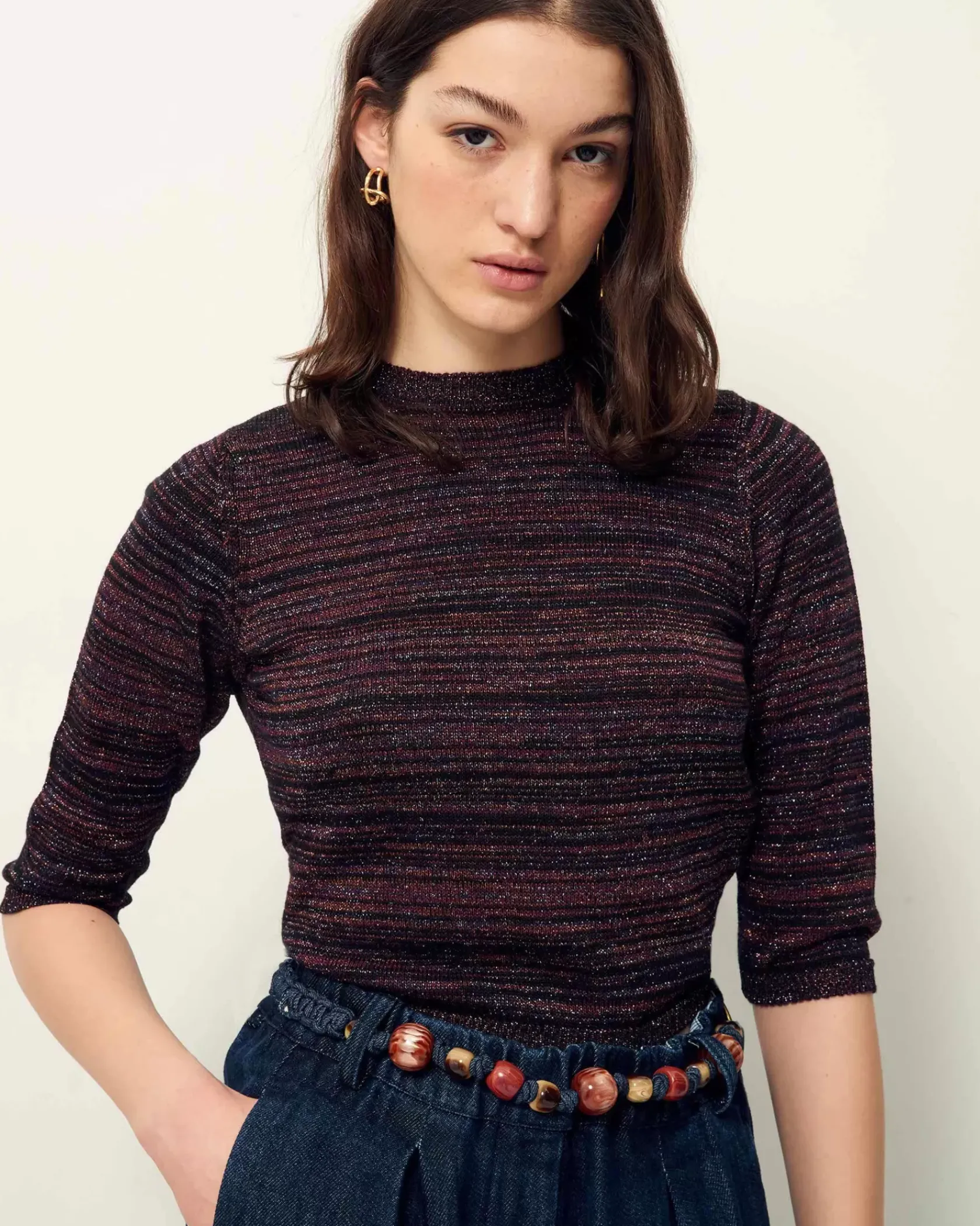 Pull court ajusté en maille jersey métallisée, tricoté en Italie.