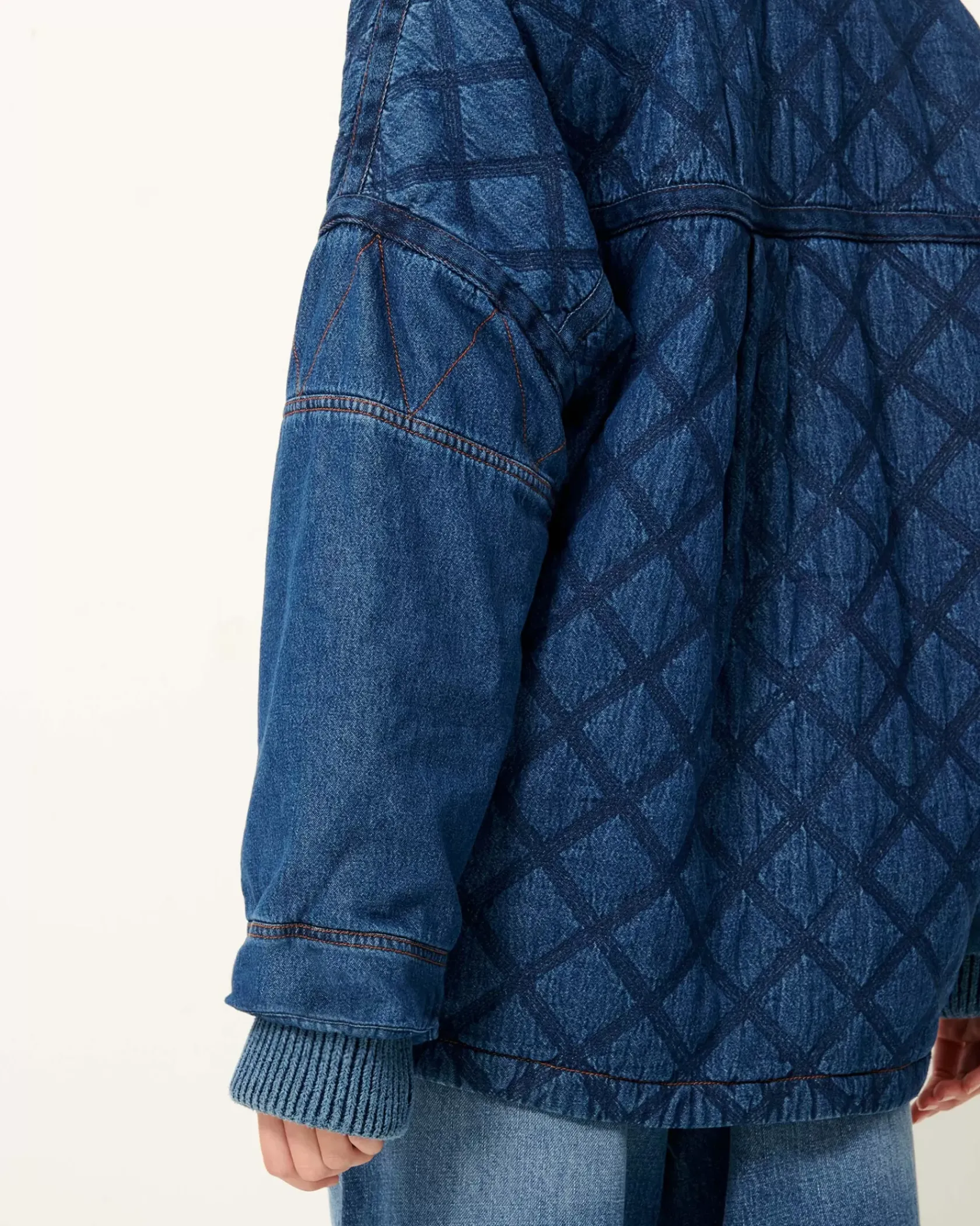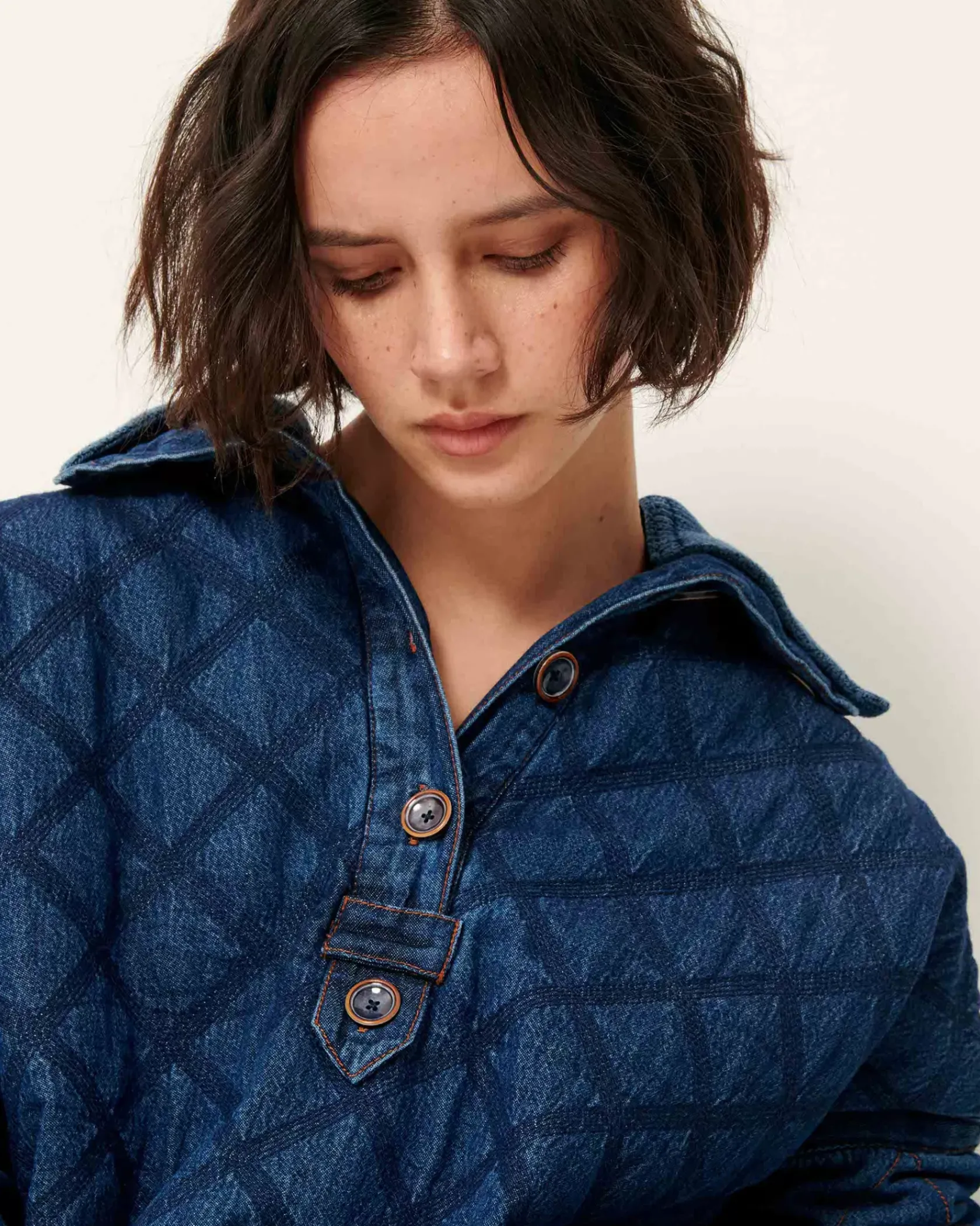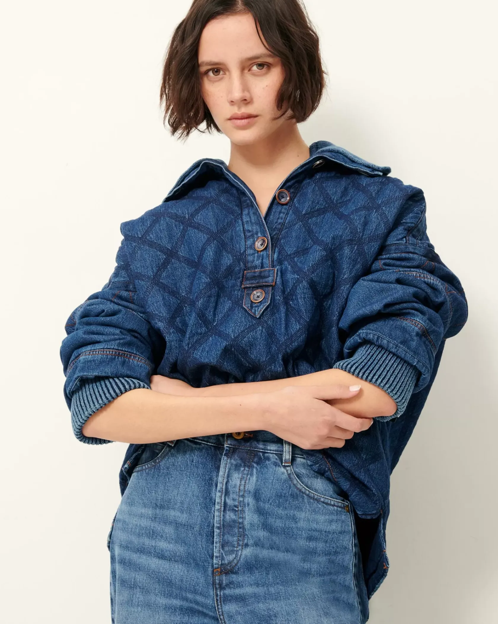 Veste esprit vareuse à col amovible en matelassage stonewashé de toile de denim.