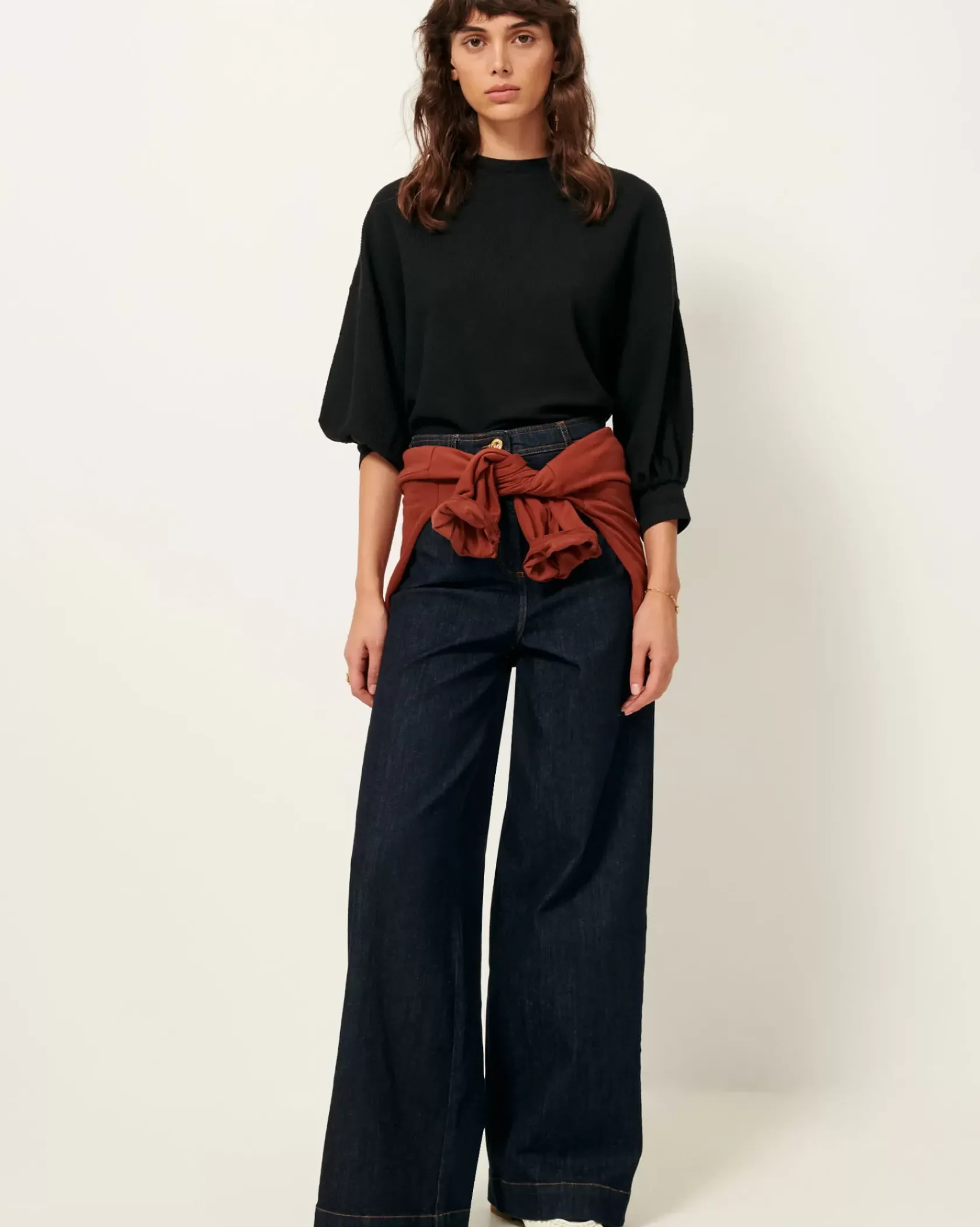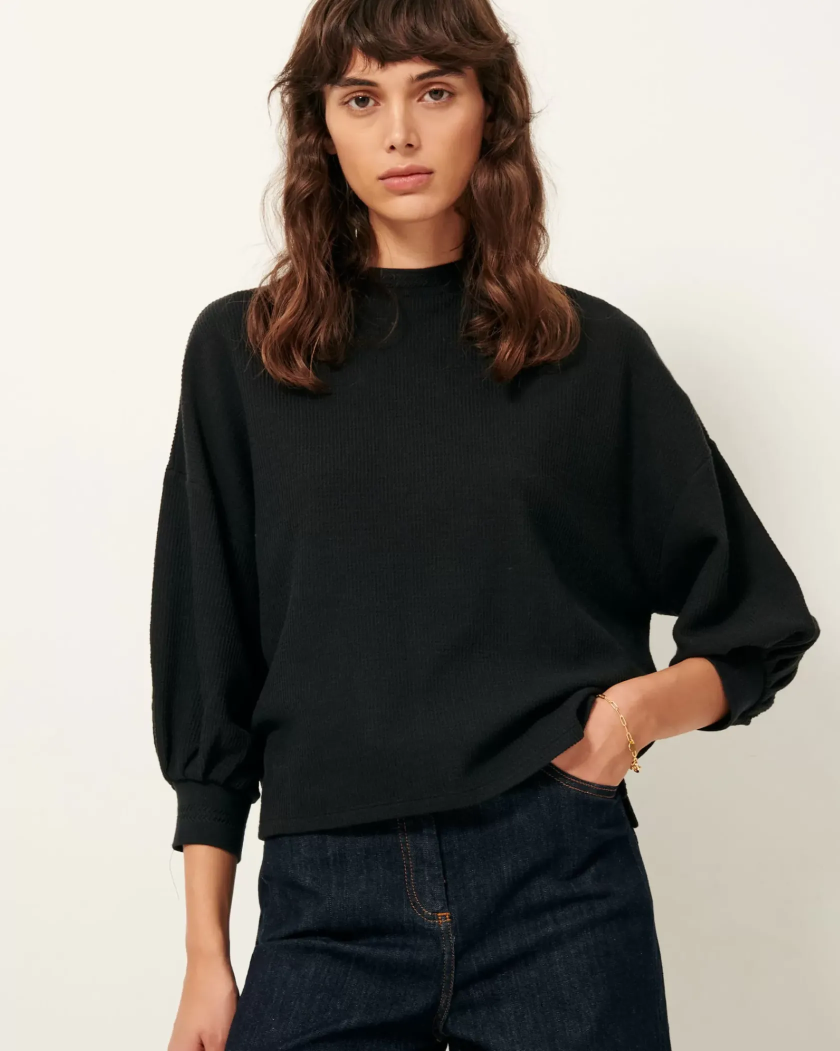 Sweat col montant en jersey lourd gaufré, effet nid d’abeille fantaisie.