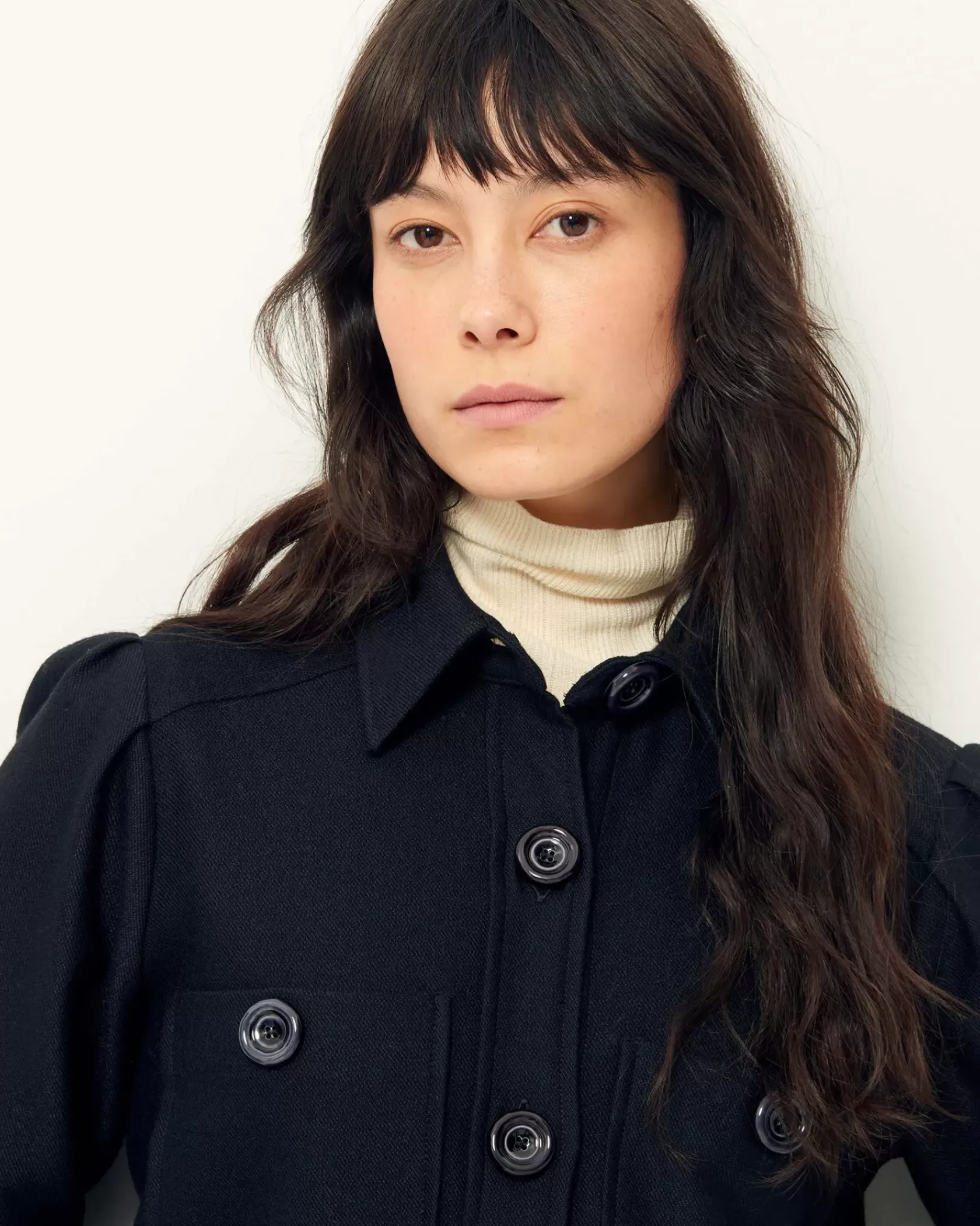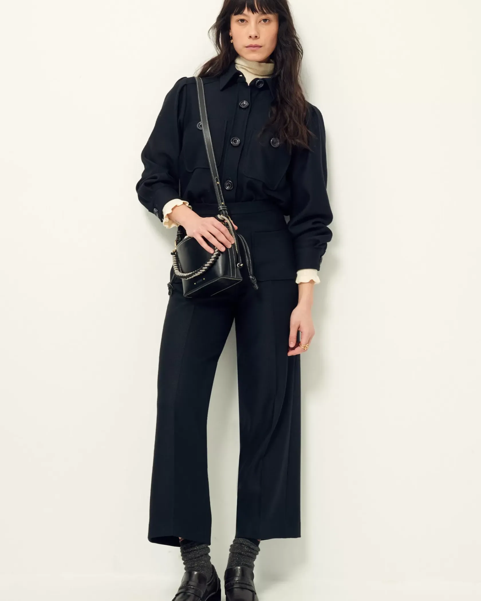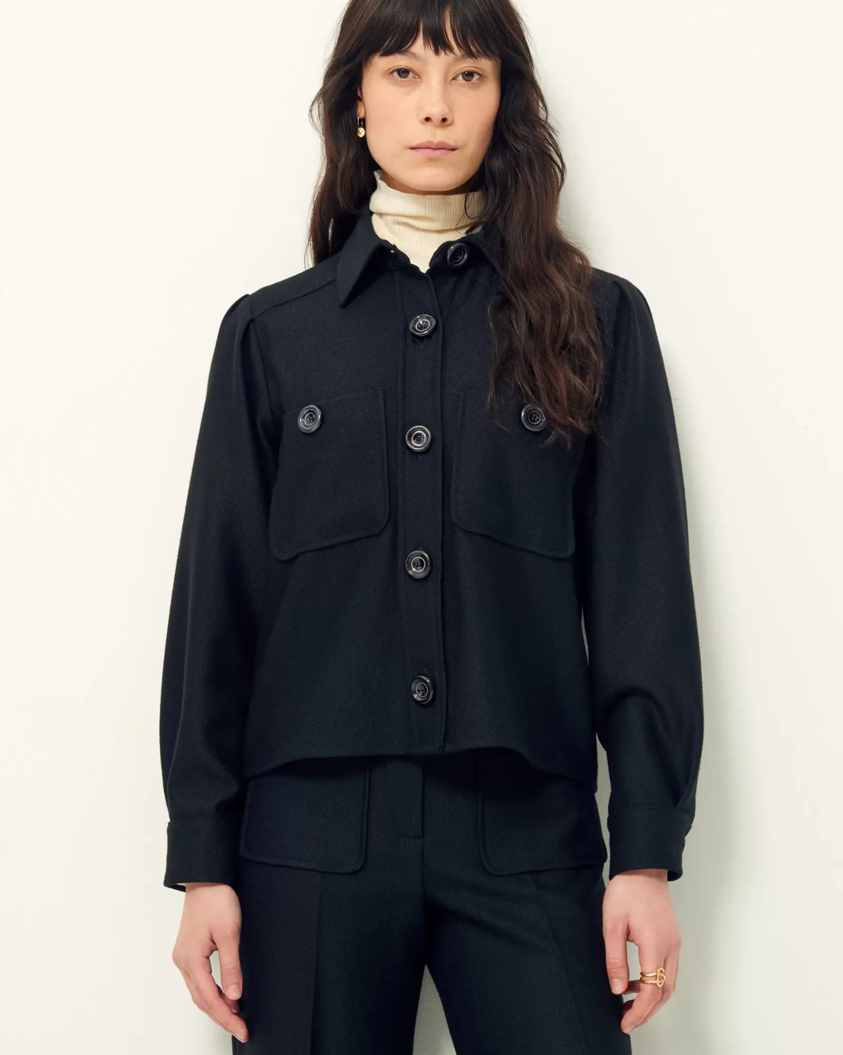 Chemise courte à poches plaquées et plis à l’épaule en tricotine fluide tissée au Portugal.