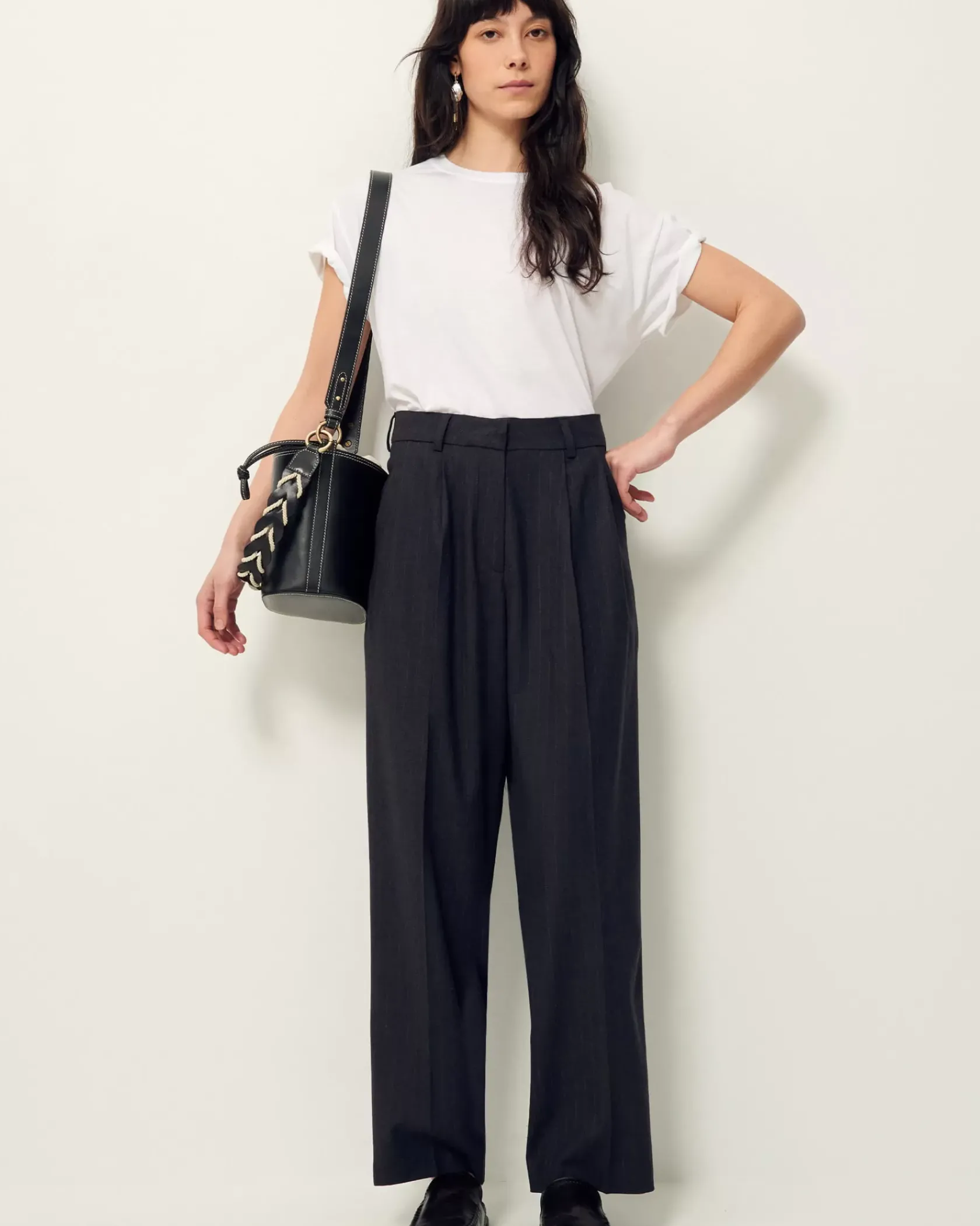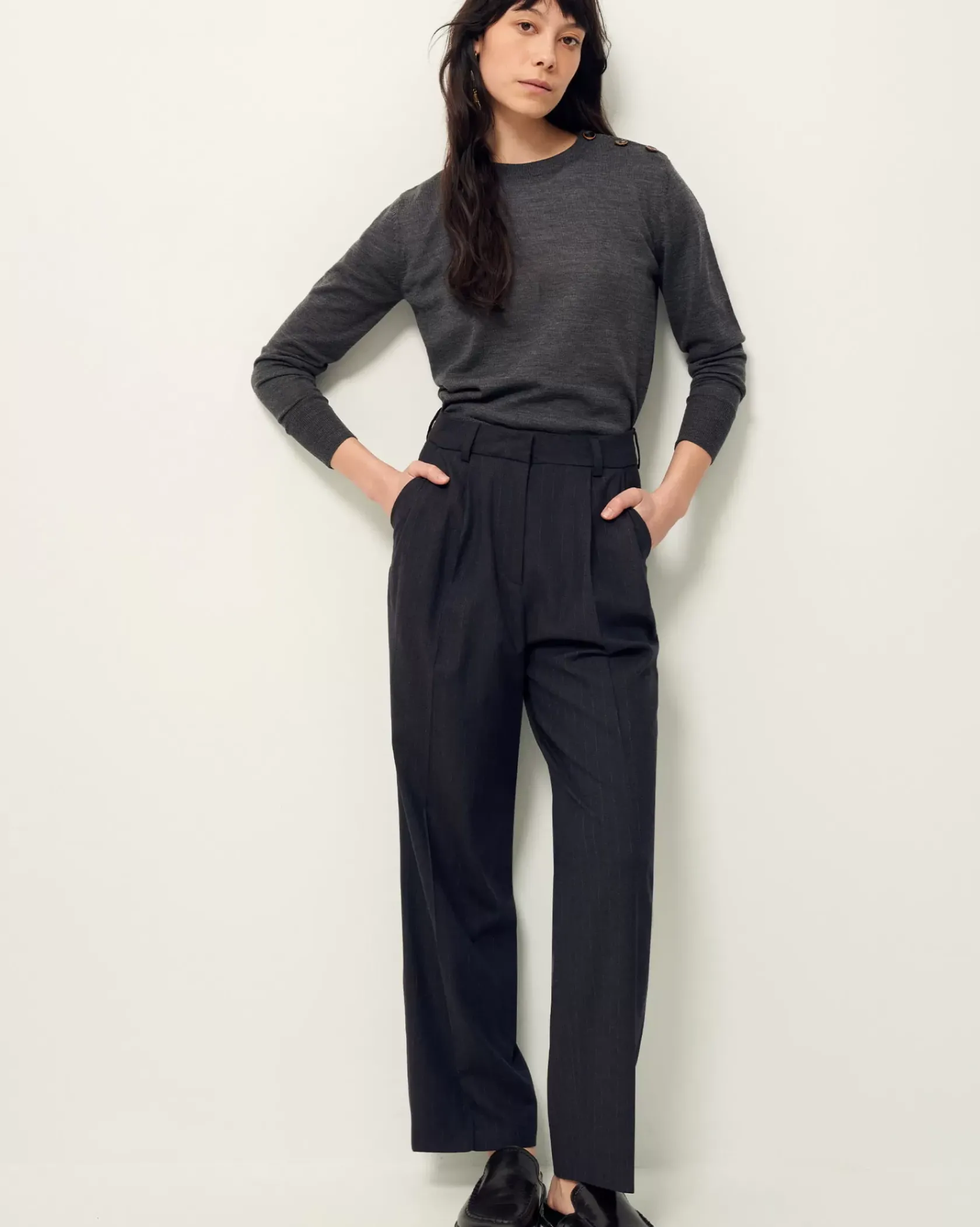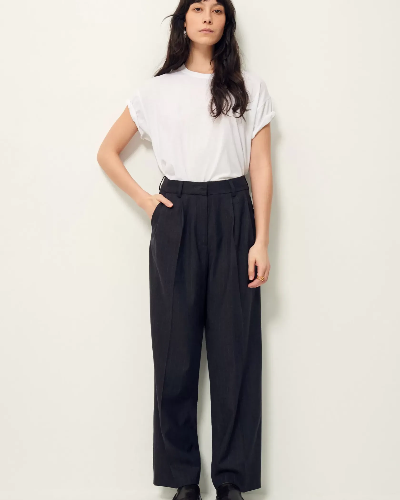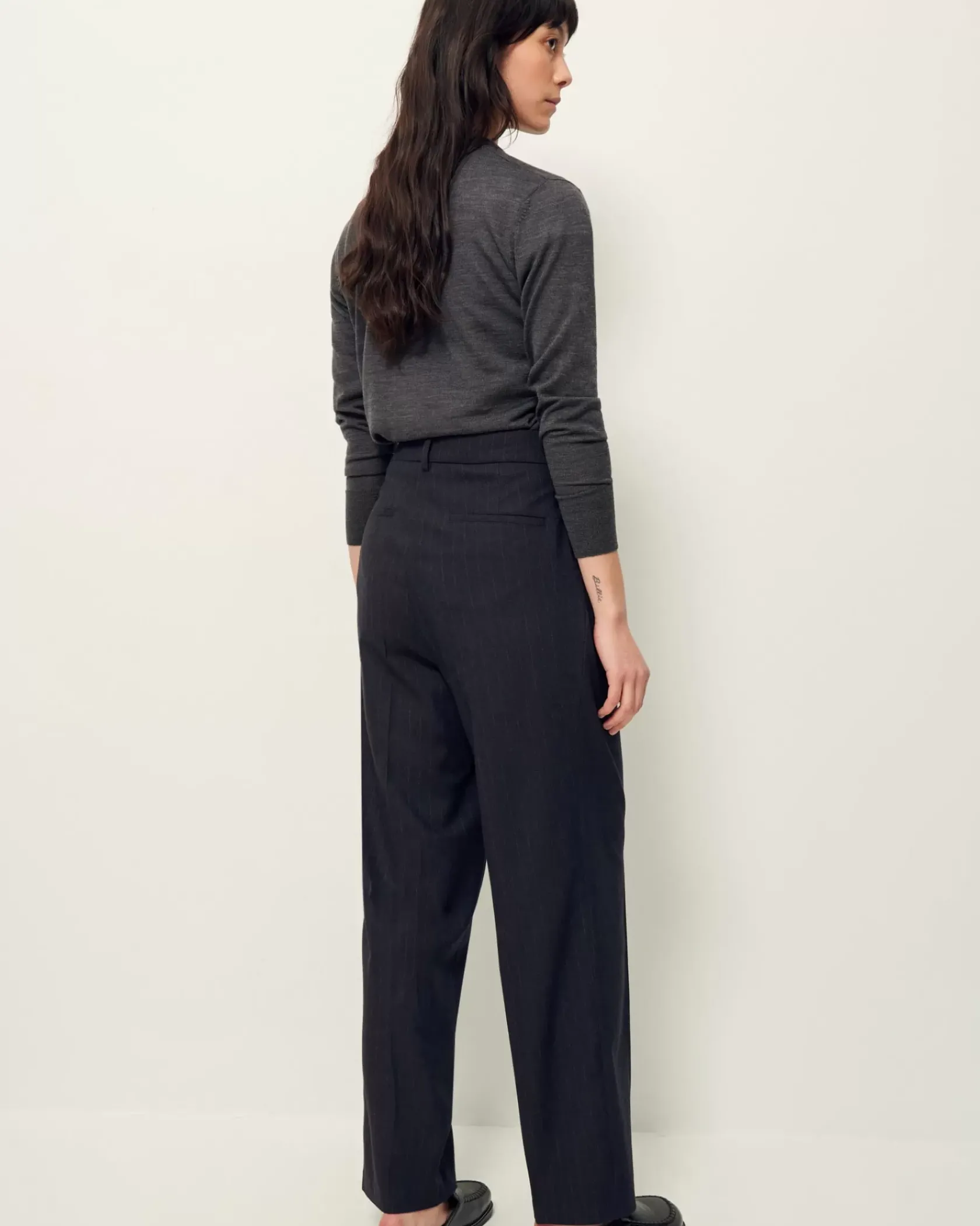 Pantalon de tailleur droit à plis couchés en flanelle à fines rayures tennis, tissée en Italie.