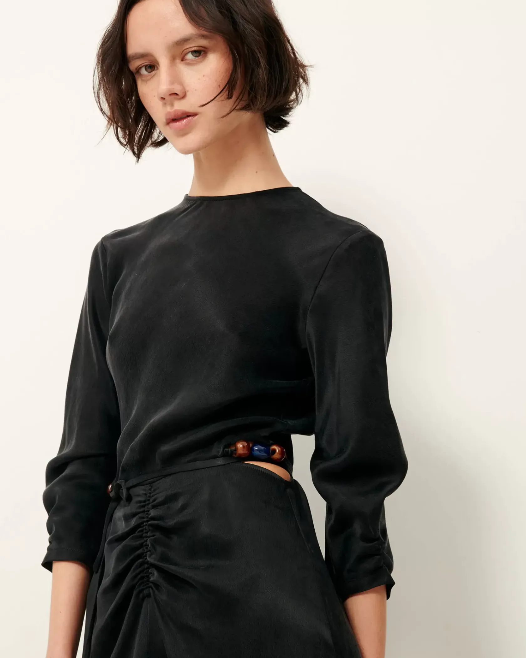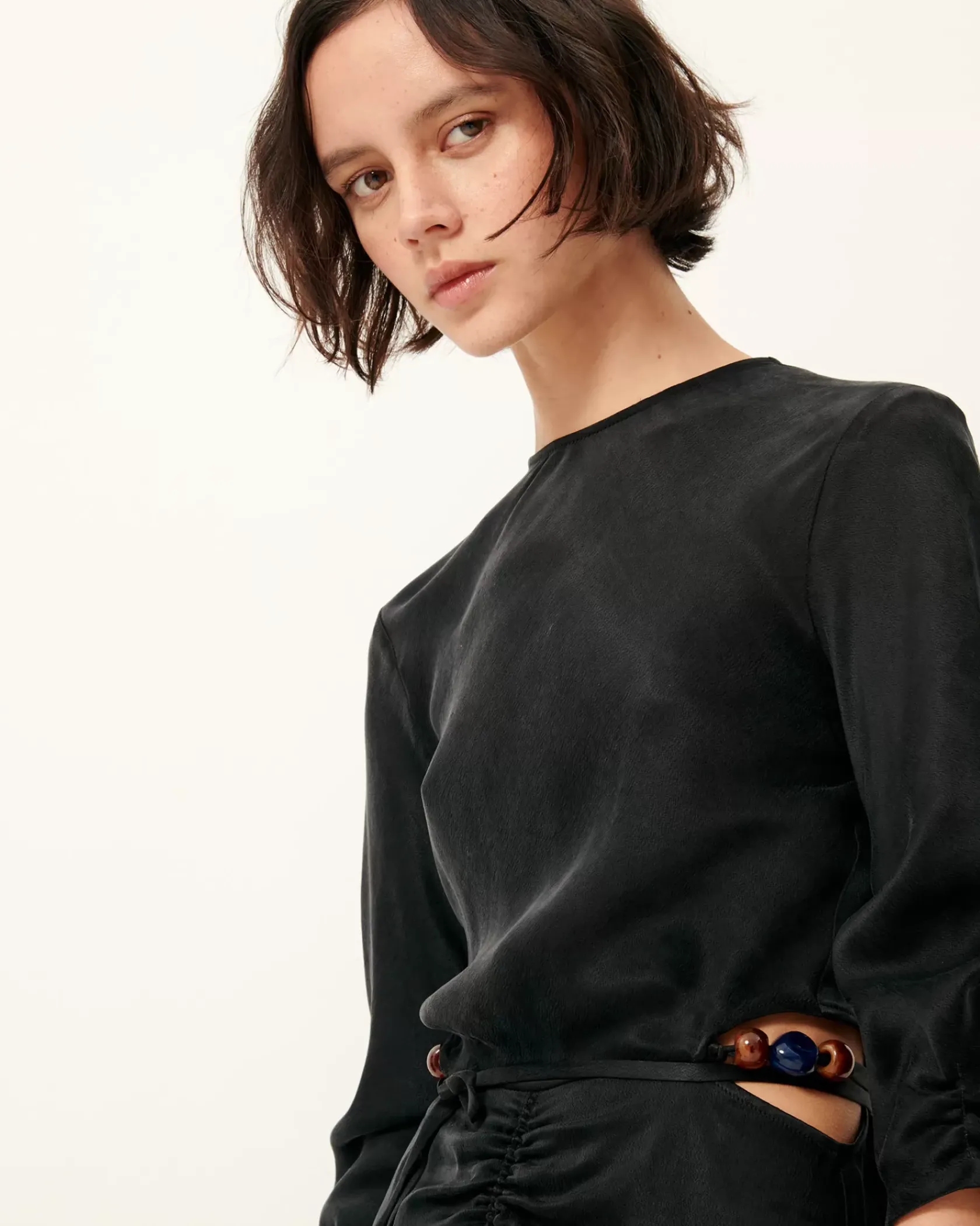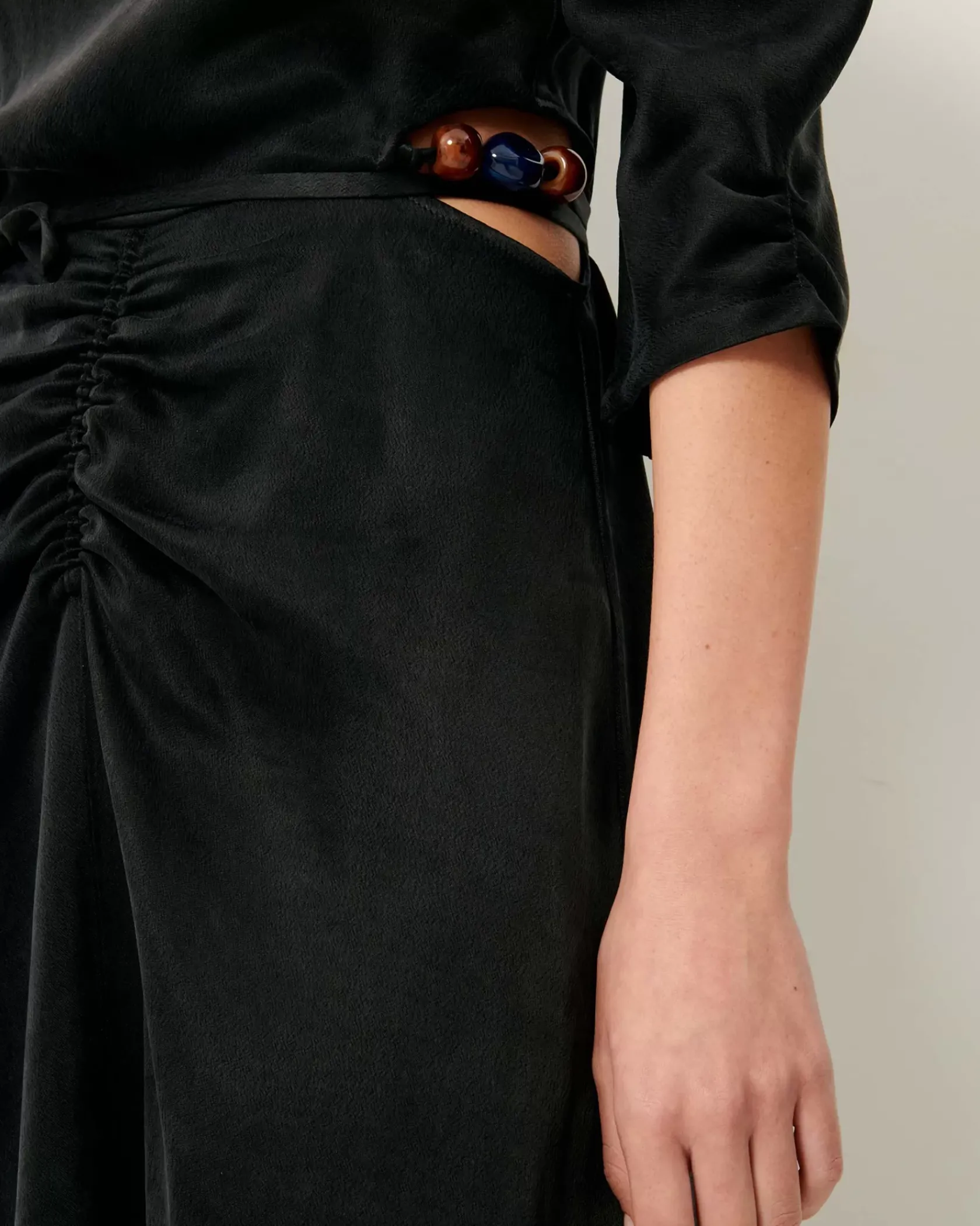 Robe longue ouverte sur les côtés, détail de liens ornés de perles bijoux colorées à nouer à la taille, en satin crêpé lourd et fluide effet velvet.