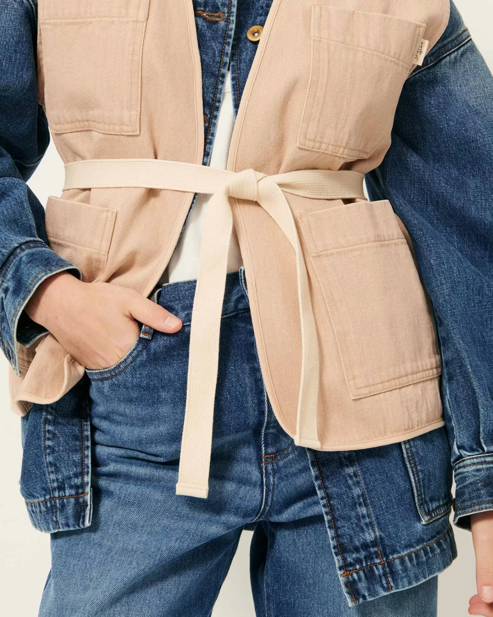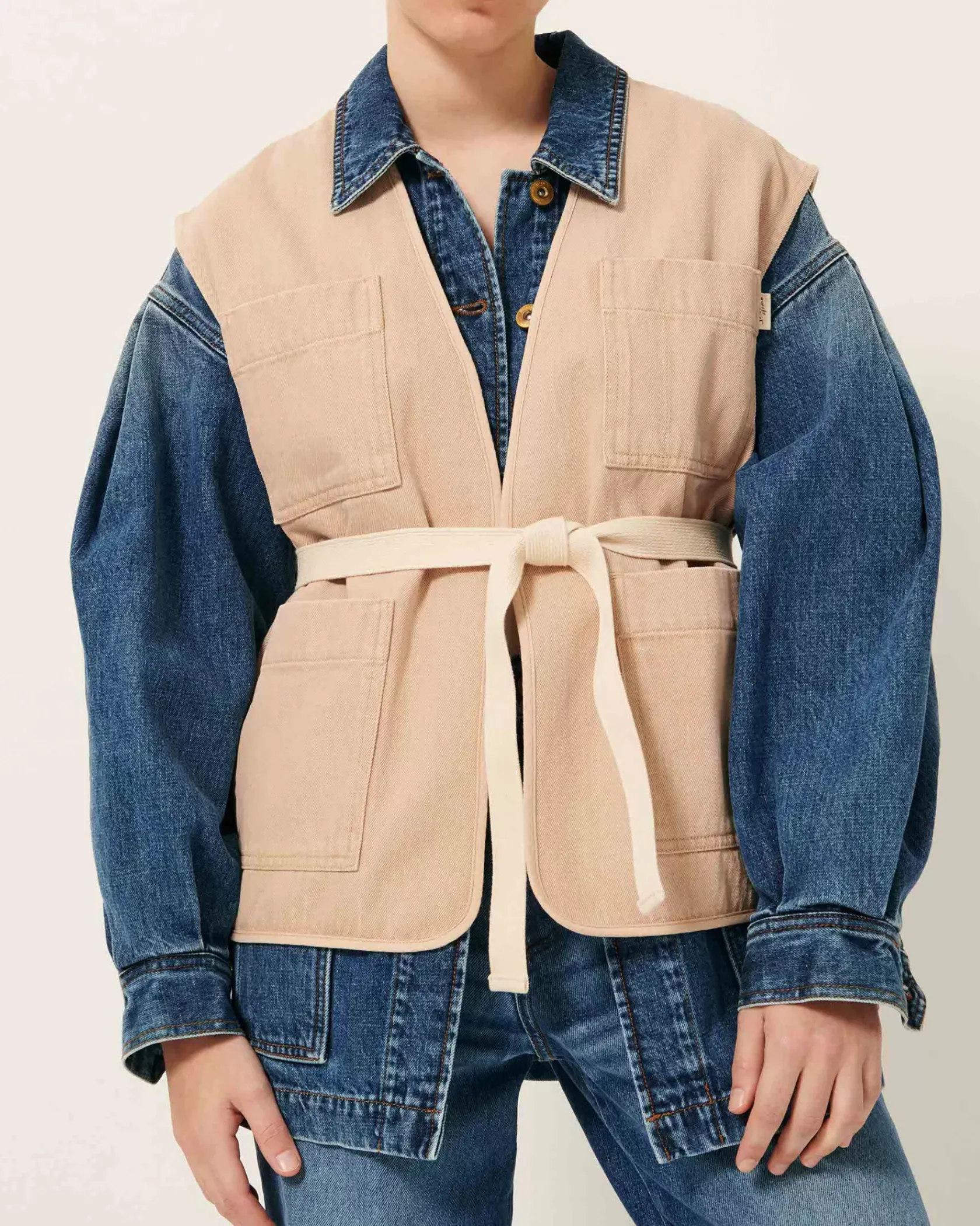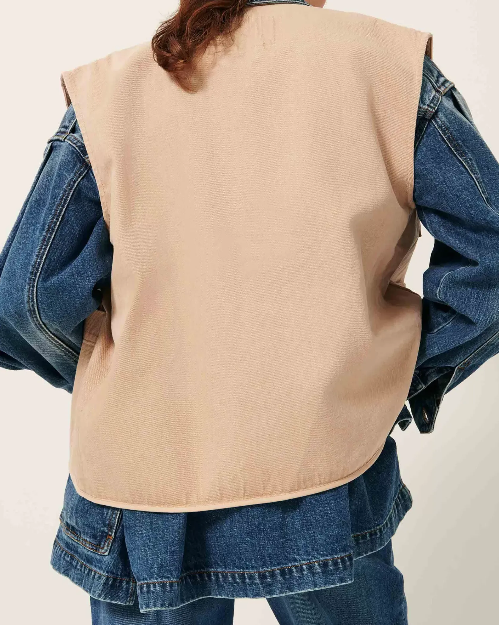 Veste sans manches à poches esprit worker en sergé de coton, fils teints, effet chambray.