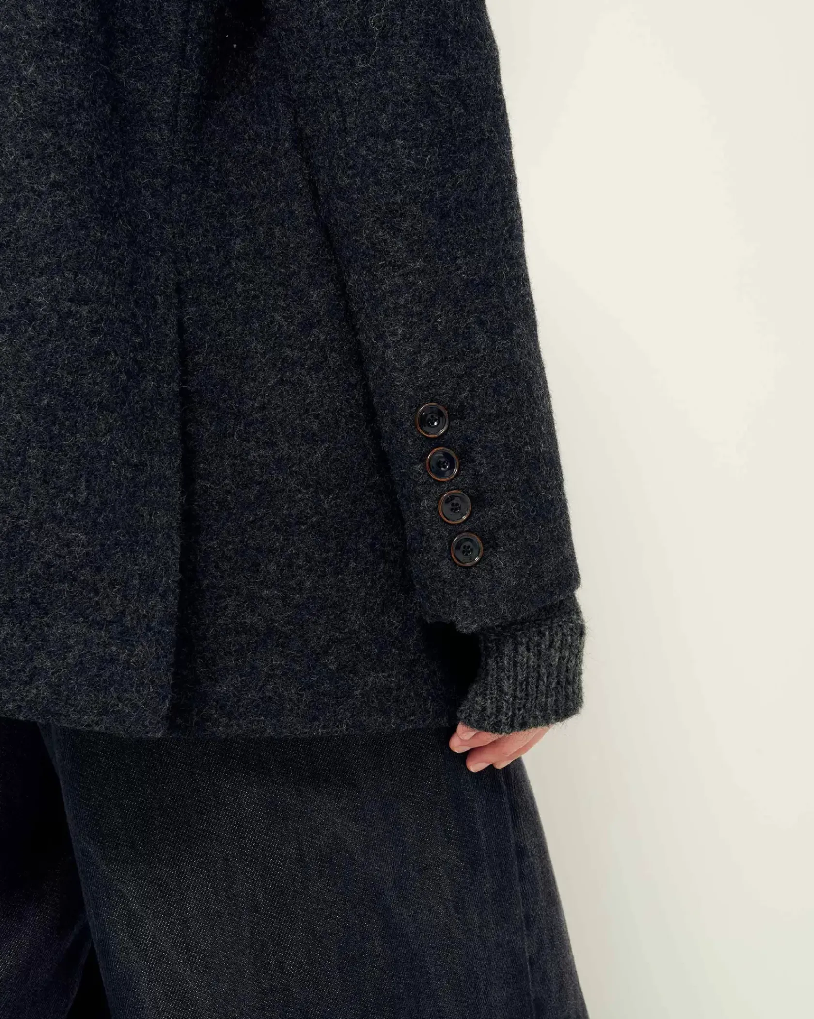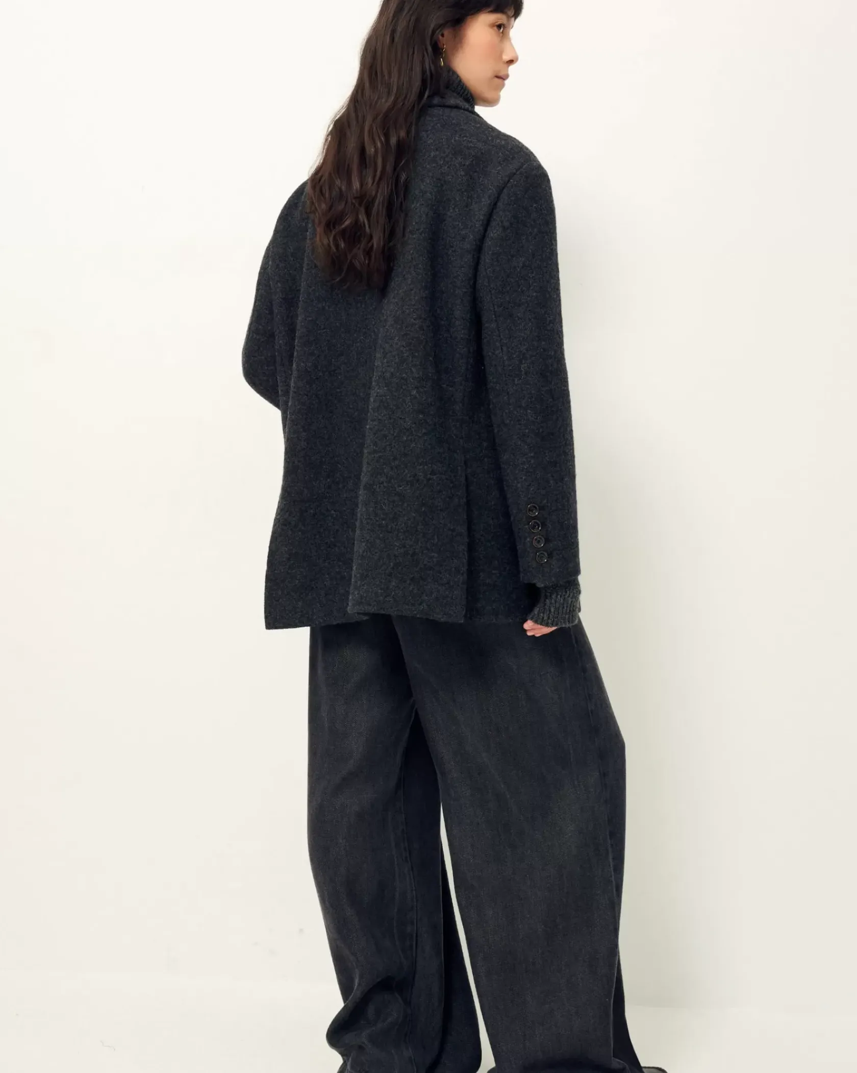 Veste de costume oversize en lainage loden (laine bouillie) chiné, en armure toile.